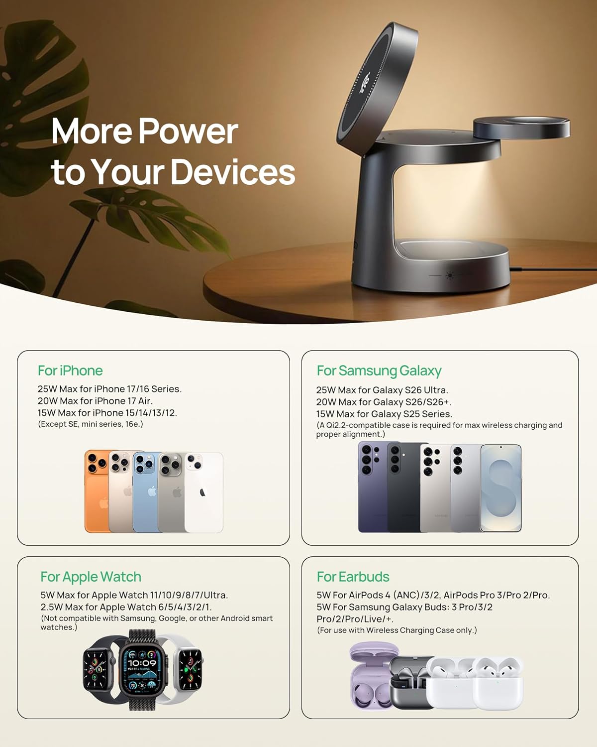 | Compatible Phone Models | For iPhone 25W Max for iPhone 17/16 Series (iOS 26+ required). 20W Max for iPhone 17 Air (iOS 26+ required). 15W Max for iPhone 15/14/13/12. (Except SE, mini series, 16e.) |