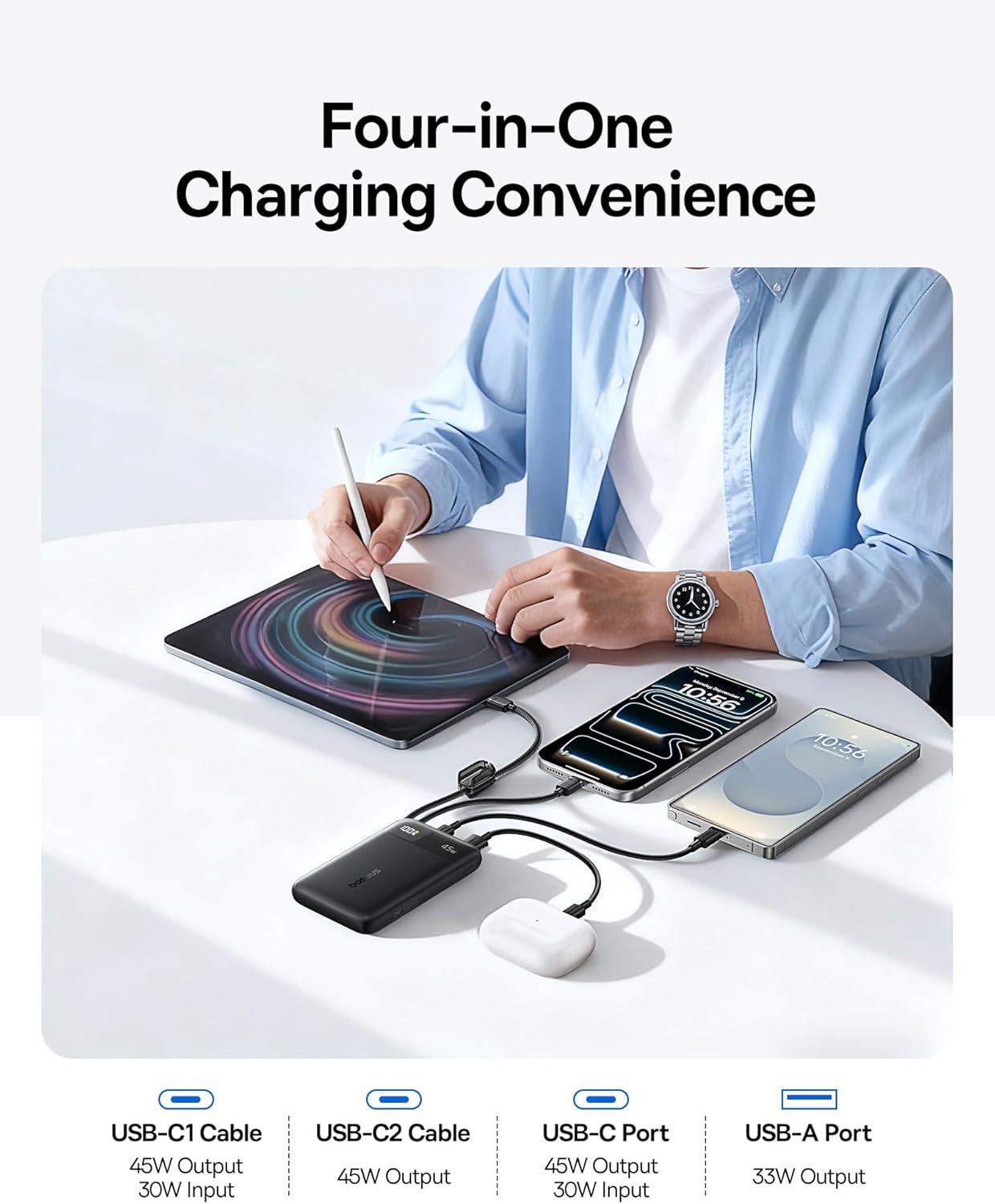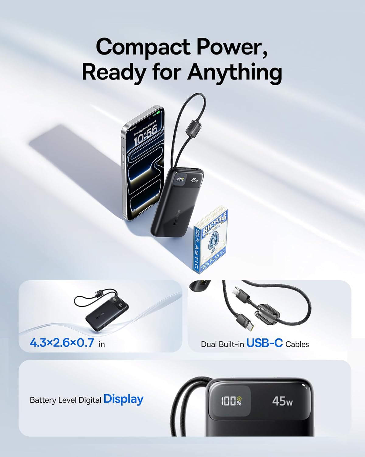 Baseus 20000mAh Compact Portable Charger 45W, CCC Certified Power Bank Built-in USB-C Cables, Travel Essential PD Fast Charging Battery Pack for iPhone 17/16 Series Galaxy S25/S24 Ultra Google iPad Baseus 45W Portable Charger, Ultra Slim 10000mAh Power Bank Built-in USB-C Cables, Travel Essential Fast Charging Pocket Size Phone Battery Pack for iPhone 17 16 Samsung S25 S24 Pixel, Google iPad etc