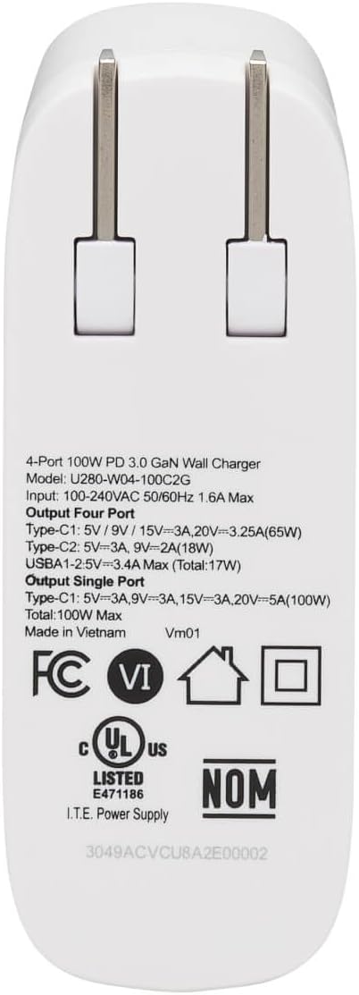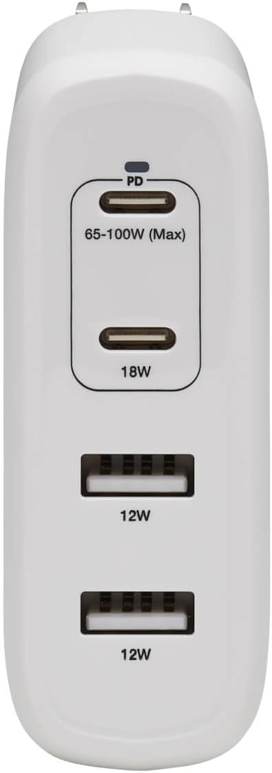 100W 4-Port Charger Gets Your Mobile Devices Ready in a Hurry, Wherever You Are This USB charger features two USB-C and two USB-A ports for quickly and safely charging your mobile devices. Plug the U280-W04-100C2G into any NEMA 1-15R, NEMA 5-15R or NEMA 5-15/20R AC outlet to ensure your laptop, smartphone, tablet and other USB devices charge at their fastest possible speed. The compact unit supports up to 100W for charging when all four ports are being used simultaneously. PD Charging Port Supports 100W for Fast Charging The USB-C Power Delivery port, when used alone, supports power output up to 20V 5A (100W), which is more than sufficient for charging and powering nearly any mobile device, such as a MacBook or Chromebook. Gallium Nitride Technology Allows High-Wattage Capacity in a Compact Package This USB wall charger is designed using GaN technology, which has a higher power density than silicon and provides higher efficiency than standard USB-C fast chargers. It also stays cool during operation, despite its small size, meaning it won’t get hot while charging your device Built-In Auto-Sensing Adjusts to Proper Power Level to Get Your Device to 100% The U280-W04-100C2G features auto-sensing technology that automatically adjusts to your devices’ appropriate power level, perfect for fast-charging tablets and e-readers. The unit protects against overheating, overcurrent, overcharging and short circuits. In fact, it stops charging as soon as your device’s batteries are at full capacity. Folding Plug Design Perfectly Sized for Travel The compact USB Type-C charger is less than 12 cubic inches, easy to carry in your purse, suitcase, backpack or laptop bag. The NEMA 1-15P plug folds into the unit when not in use to shield it from damage and prevent it from snagging or scratching your bag’s contents.