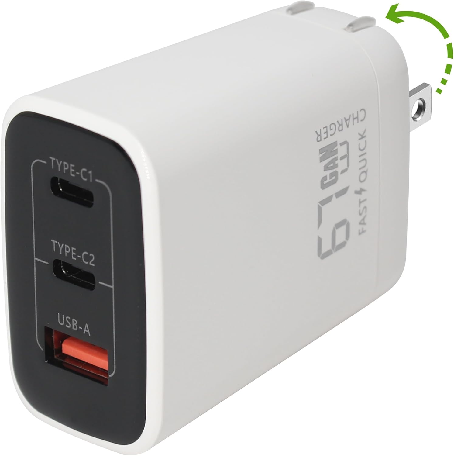 Fast and Compact 67 watt USB-C GaN Power Adapter - 3 Ports: 2 USB-C and 1 USB-A. Compatible with SmartPhones, Tablets. Laptops and Thousands of Other Devices.Compatible with iPhone, iPhone Plus / Pro / Pro Max / Mini / SE 2 / SE 3 / iPad / iPad Air / iPad Pro / iPad Mini / MacBook Pro / MacBook AirCompatible with Samsung Galaxy S, Ultra / Note Series / A Series / Z Flip Series / Z Fold Series / Galaxy Tab S Series & S Ultra - Pixel / Pixel ProCompatible with Lenovo Chromebook Duet / Lenovo ThinkPad / Google Pixelbook / HP Chromebook / HP Spectre Folio / Dell XPSAdvanced GaN (gallium nitride) Technology: 67W GaN Power Delivery. Delivers Fast, Efficient Charging with a 67W Max Output. Whether you’re charging your laptop and phone together or powering a tablet and accessories, you'll get efficient and reliable power.Simultaneous Multi-Device Charging: Equipped with 2 USB-C and 1 USB-A ports, this charger allows you to fast-charge your laptop, tablet, and smartphone all at once. Output up to 67W for a single device ensures lightning-fast power when you need it most.Compact & Portable Design: Smaller than traditional 67W chargers, this lightweight GaN charger is easy to carry, making it perfect for travel or daily use without compromising on power.Comprehensive Safety Protection: Built-in safety systems with temperature control and overcharge protection ensure your devices are charged safely, while maintaining top performance and durability over time.