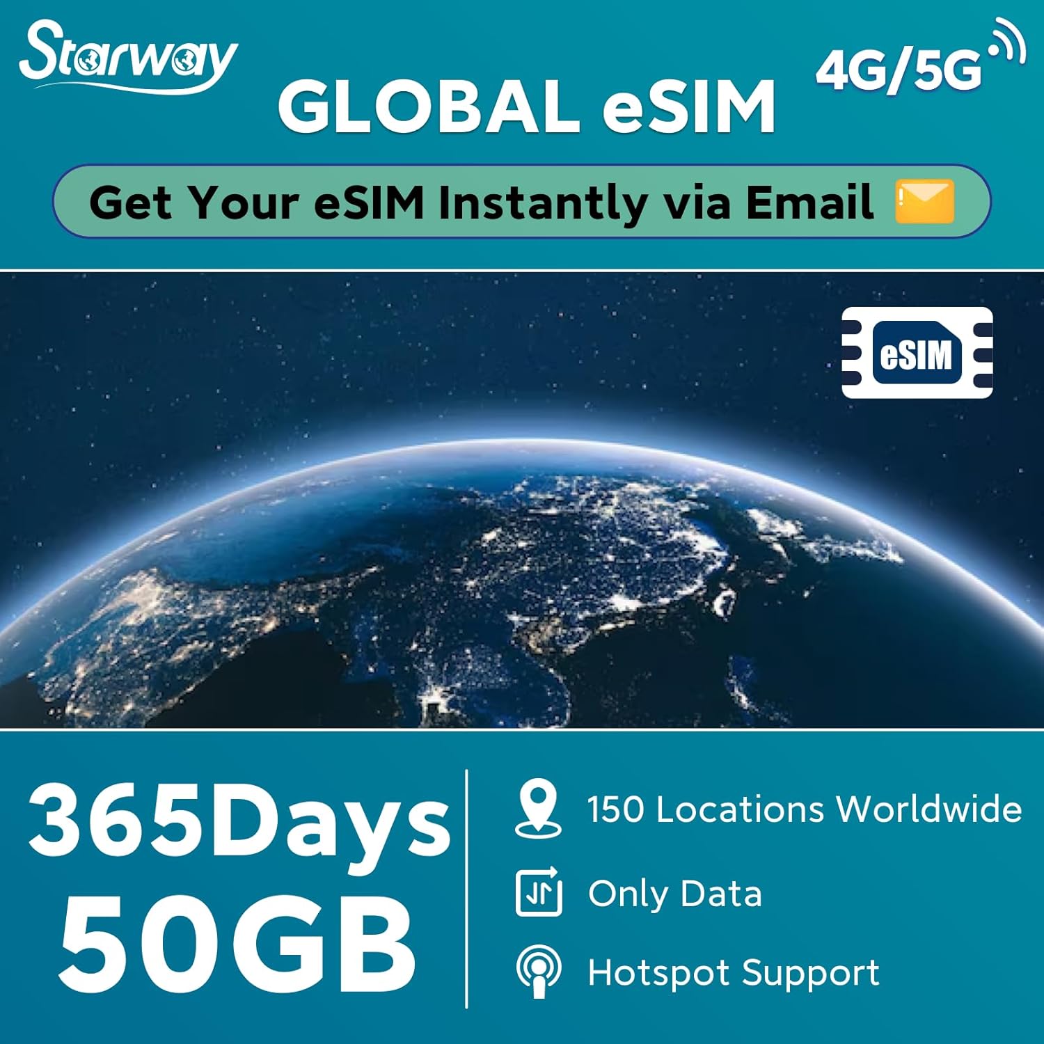 Instant Global eSIM: 45GB in 90 Days Get your eSIM instantly via email - Instant Access - Forget Shipping Delays! Go to mcrmgr.umacaroon.com/starway, enter your info, and receive your QR code immediately. Plan Includes: 45GB high-speed 4G/5G data for 90 days Unlimited data at 256Kbps after high-speed data used Hotspot sharing supported Data only - no calls or SMS Works in 150 Global regions including Europe, Mexico, Canada, Asia, Australia & NZ, Latin America, Africa. Powered by leading local carriers for reliable coverage. Compatible with all unlocked eSIM-supported Apple and Android devices. Need help? Contact us: service_esim@urocomm.com We provide professional pre-sales and after-sales support.