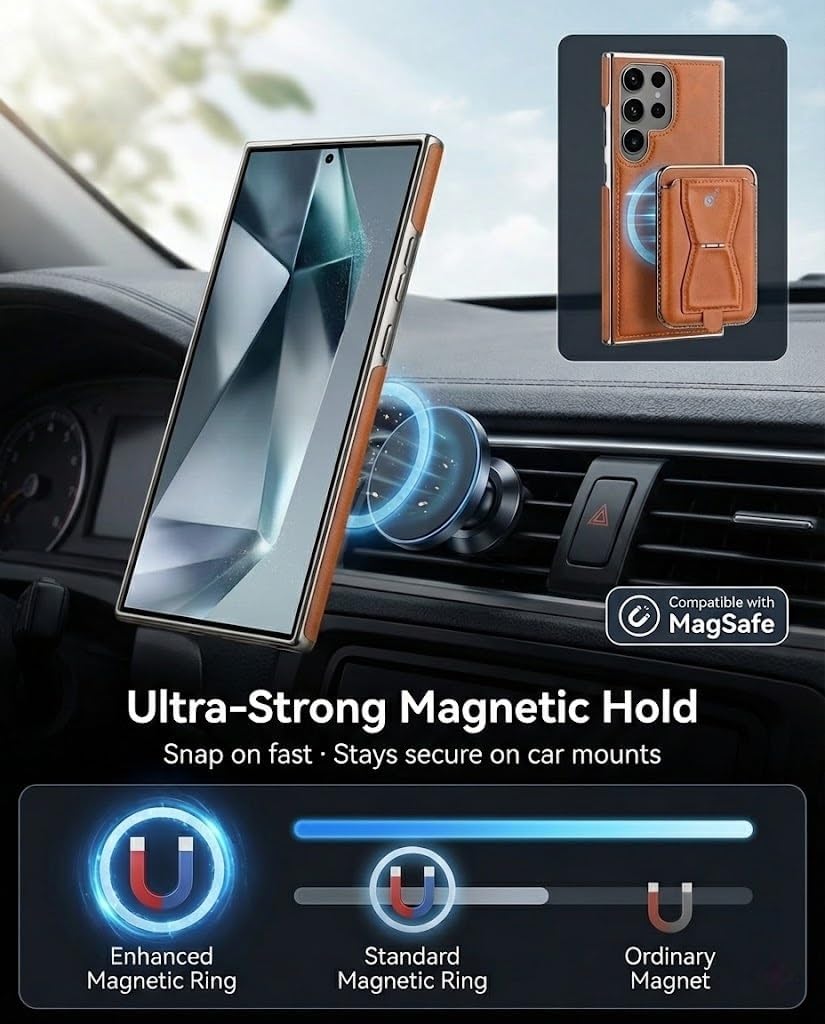 NEW DESIGN — S26 SERIES READYA refined leather wallet phone case designed for everyday carry—balancing card storage, magnetic convenience, and reliable protection in a slim, modern profile.What You’ll Love Refined faux leather with natural grain texture Magnetic wallet design for cards and daily essentials Detachable wallet for wireless charging compatibility Built-in stand for vertical and horizontal viewing Slim profile without unnecessary bulkDaily Protection Details Raised edges help protect screen and camera from surface contact Reinforced frame helps absorb everyday drops and bumps Neat stitching and clean edge finishing for long-term use Comfortable grip with an easy-care, fingerprint-resistant surfaceTECHNICAL HIGHLIGHTS Compatibility:For Samsung Galaxy S26 / S26 Plus / S26 (2026 Release)Also compatible with S25 and S24 series Material:Refined PU Leather + Protective Inner Shell Magnetic System:Built-in magnetic wallet (detachable for wireless charging) Features:– Wireless charging compatible (wallet removed)– Built-in kickstand– RFID-blocking card wallet– Full-cover protectionPackage Includes 1 × Leather Magnetic Wallet Case for Samsung Galaxy S Series
