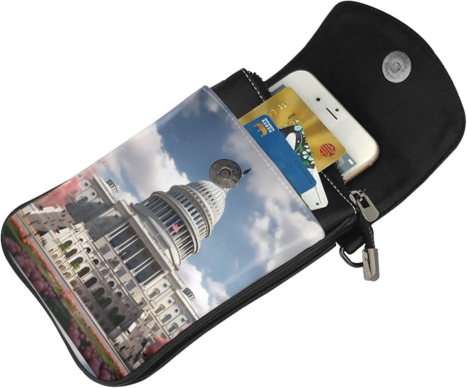 The MSRHIUEF United States Capitol Printed Small Cell Phone Purse 7.6x4.9in stands out as a fashionable, practical, and multifunctional accessory for women. Made from high-quality soft synthetic microfiber leather, this purse is not only durable and waterproof but also features a soft lining material for added comfort. Its design includes a magnetic buckle and gold hardware, adding a touch of elegance, while the detachable shoulder strap offers versatility in carrying options. The special flip closure ensures security, making it suitable for various occasions such as daily use, travel, or outdoor activities like walking, camping, and shopping. Despite its compact dimensions, the purse is surprisingly spacious, capable of holding essentials like cash, cards, keys, some makeup, and smartphones up to 5.5 inches, thanks to its magnetic snap button phone pocket. Additionally, it boasts one front pocket
