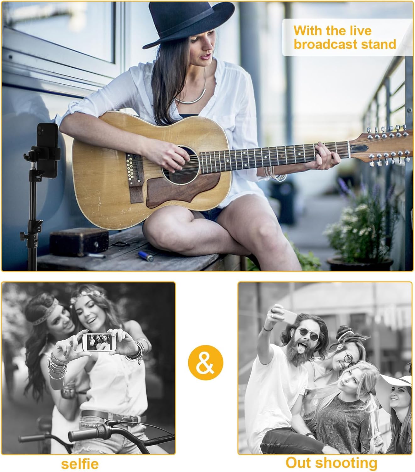 Package Include 1 1 x shutter 1 x phone clip 1 x connector Features -Material: Stainless steel, iron, plastic -Product Info: -Color: Black -Size: About 160.00X32.00X32.00cm/62.88X12.58X12.58inch - The tripod can be folded, does not occupy holder for video recording. - This phone stand is suitable for desktop conferencing, live streaming and etc cell phone stand for desk. - Mobile phone clip is suitable for most smart phones of 6-10cm phone holder stand. - Strong support and wider range of use for watching video movies, webcasts, etc mobile phone stand holder. - Selected material, which is not easy to deform or break.Goods Descriptionadjustable phone stand Share with your friends and families, convenient and practical.phone holder for video recording It is easy and convenient for you to have streaming or , etc.phone recording stand This is a live streaming phone stand, which is made of , durable and can be used for a long time