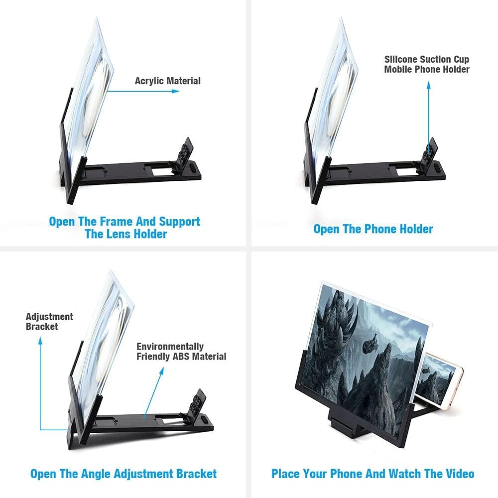 14 inch 3D Screen Magnifier- HD Cell Phone Screen Enlarger Movie Amplifier Magnifying Glass with Foldable Stand-for and All Other Mobile Phones More and more people use their smartphones to watch videos or movies, however, it gets incredibly uncomfortable to watch a small screen for longer periods of time, and it can even damage your vision. If you often watch videos and movies and are tired of uncomfortably staring at a small screen, our screen magnifier is perfect for you. Product Specification: 1. Perfect Viewing Experience:Magnifies your smartphone screen display 2 to 3 times to make it easier to watch movies, videos, or news on your phone. 2. Universal Compatibility:This screen magnifier is almost universal. It can enlarge the display of your cell phone to 8.0 inch, 3. 3D Effect And Radiation Protection:Take HD zoom optical technology, PU leather + 3D screen, 3D visual enjoyment. Effectively prevent the radiation generated by the mobile phone to harming the human body. 4. Great Gift:This would also be a sweet gift for your grandparents if they have trouble reading or would like a device that enhances images so that they can view the picture of they loved ones. You can give it to teen girls or kids, improve their instragram game! 5. Convenience:Light weight and portable. Super slim when folded and can be carried around in purse or bag easily.Carry it with you for all occasions - indoors, camping, on the go, leisure, etc.We believe that you will be impressed with our and high quality products! Package Include: 1 x Phone Screen Magnifier (14")(Excluding mobile phones and other props) The monitor is not calibrated the same, and the color of the item shown in the photo may be slightly different from the actual product. Please refer to the actual product.