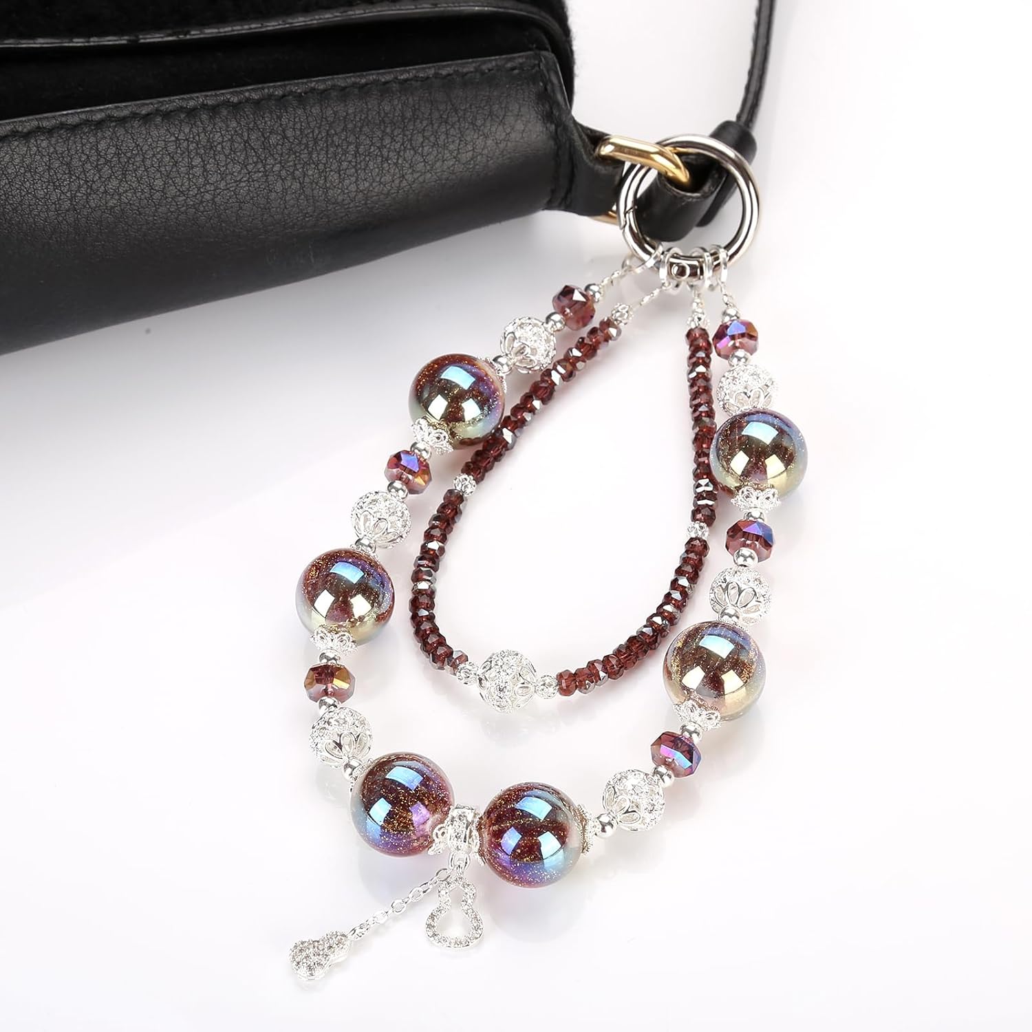 This 2-piece set includes deep black textured crystal & pink-purple gradient phone wrist strap. Handmade beaded phone strap works as stylish phone charm and anti-lost phone wristlet. Universal for most phones and phone cases with lanyard hole. Lightweight, durable and comfortable for daily use. Perfect as phone chain and gift.