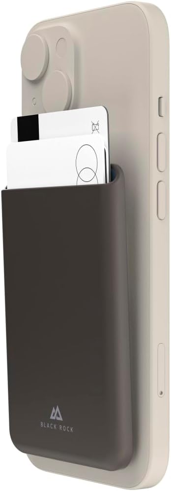 Black Rock Card Holder for iPhone 12/13/14/15, MagSafe Compatible (Magnetic, Thin, Slim Wallet, Card Case for ID, Credit Card etc., Wallet for Apple iPhone, Silicone) Black The magsafe compatible wallet from Black Rock holds directly to the back of magsafe compatible Apple iPhones such as iPhone 15 Plus, iPhone 15 Pro, iPhone 15 Pro Max, iPhone 14, iPhone 14 Plus, iPhone 14 Pro, iPhone 14 Pro Max, iPhone 13, iPhone 13 Mini, iPhone 13 Pro, iPhone 13 Pro Max, iPhone 12, iPhone 12 Mini, iPhone 12 Pro and iPhone 11. 2 Pro Max. The camera on the back of the iPhone remains fully usable even with the card case attached. The card holder offers space for EC cards, credit cards, ID cards or similar. The soft silicone surface of the case makes the wallet for Apple iPhone a real worry stone and is very trendy with its minimalist design. By the way: the card case is an ideal companion in everyday life even without an iPhone - both for men and women. The mobile phone card case is thin and lightweight and therefore fits in any pocket. Technical details: Colour: black. Colour: black. Recommended Use: Smartphone Suitable for: credit card