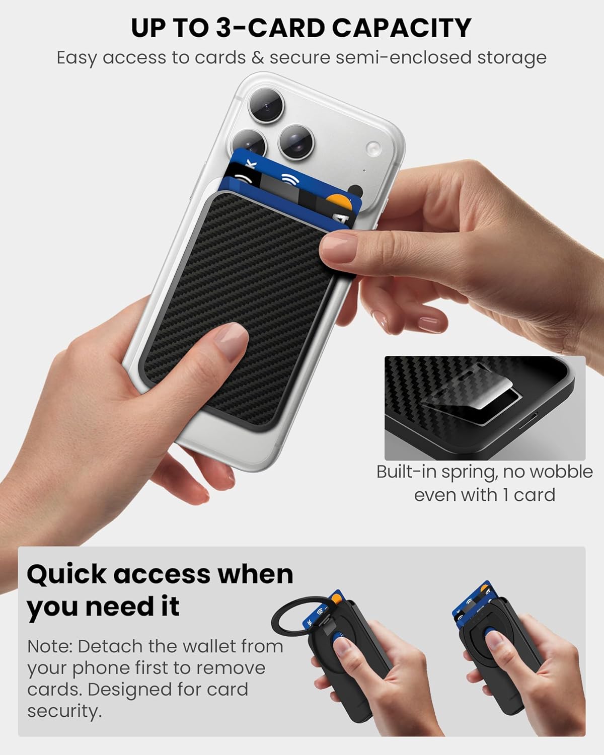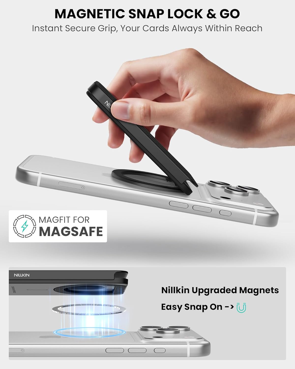 Nillkin for MagSafe Wallet Stand with 1500D Aramid Fiber & Aviation-Grade Aluminum Alloy & RFID Blocking & Adjustable Stand Quality and characteristics: 1. 1500D Aramid Fiber & Precision-Machined Aluminum Alloy 2. Adjustable Stable Stand for Portrait/Landscape Viewing 3. Max 3-Card Capacity with Spring Clips 4. Advanced RFID Signal Isolation for Card Data Security 5. Magnetic Design, Integrated Carry, No Extra Pockets Needed 6. Not Support the Find My Function