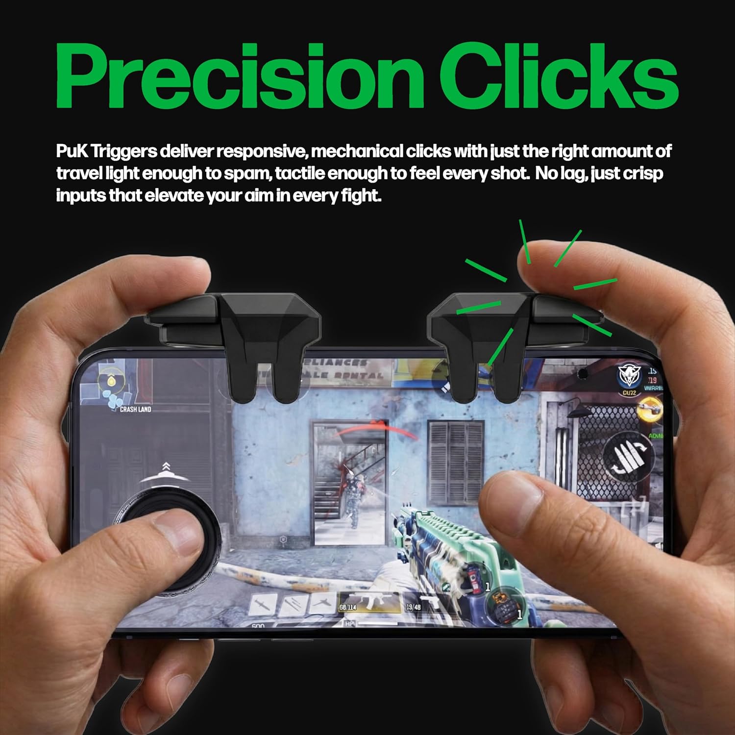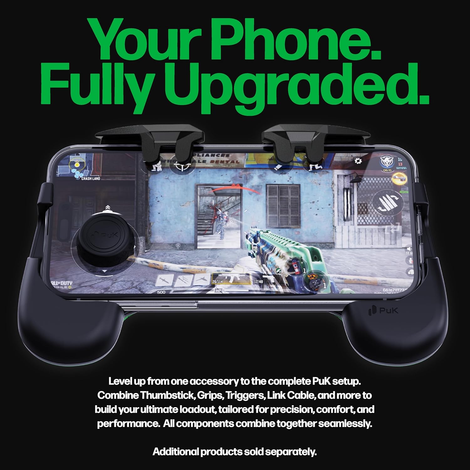 The PuK One Mobile Gaming Bundle is the all-in-one control upgrade for serious mobile gamers. Combining PuK's three most powerful accessories into a single kit, the PuK One gives you everything you need to dominate on your phone. The PuK Magnetic Phone Joystick delivers smooth 360° analog control with zero lag, the clip-on Mobile Gaming Triggers give you tactile, mechanical precision for faster shooting, and the Phone Gaming Grip keeps your device secure and your hands fatigue-free through long sessions. All three accessories attach directly to your phone with no Bluetooth, no batteries, and no setup required. Whether you play Call of Duty Mobile, PUBG, Fortnite, or any other action game, the PuK One Bundle puts console-level control in your hands. Compatible with iOS and Android devices.