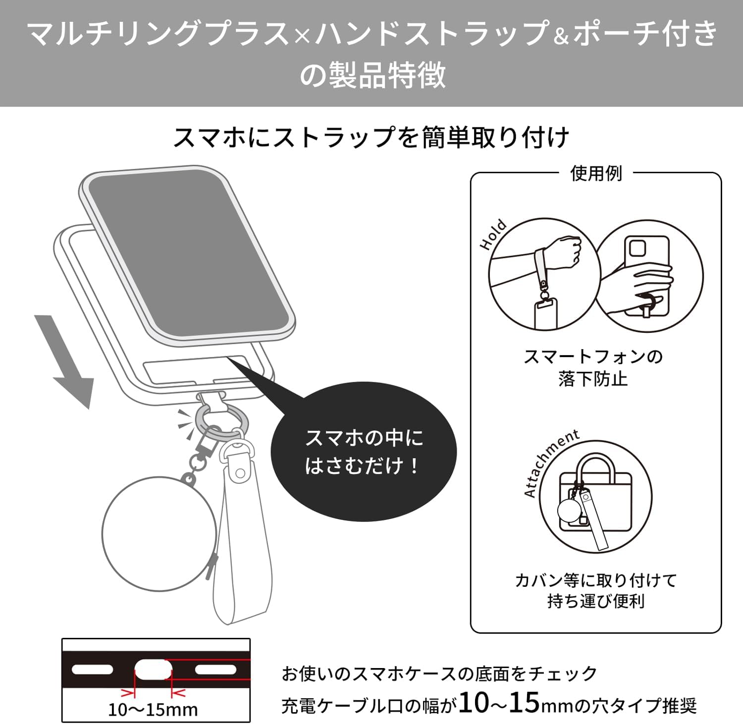 A multi-use smartphone accessory that can be used simply by sanding it inside a smartphone case. Pass your finger through the ring to improve the ability to hold your phone and prevent it from falling out. It can be used for a variety of purposes, such as carrying the ring by hand, or attaching it to your bag or belt loop. When combined with the included hand strap, you can carry your smartphone in a fashionable way and help prevent it from falling out. Hand strap is approx. 5.5 inches (14 cm) (when in use). Comes with a pouch that is perfect for storing earphones and cables. This product is recommended to be used in conjunction with a smartphone case with a width of 0.4 to 0.6 inches (10 to 15 mm). Please note that when using in cases other than the recommended dimensions, the product may be easily removed from the charging port. The color of the actual product may differ slightly from the product depending on your monitor settings, lighting in the room. Due to various circumstances, the design and specifications may change without prior notice. © Nintendo, Creatures, Game Freak, TV Tokyo, ShoPro, JR Kikaku © Pokémon.