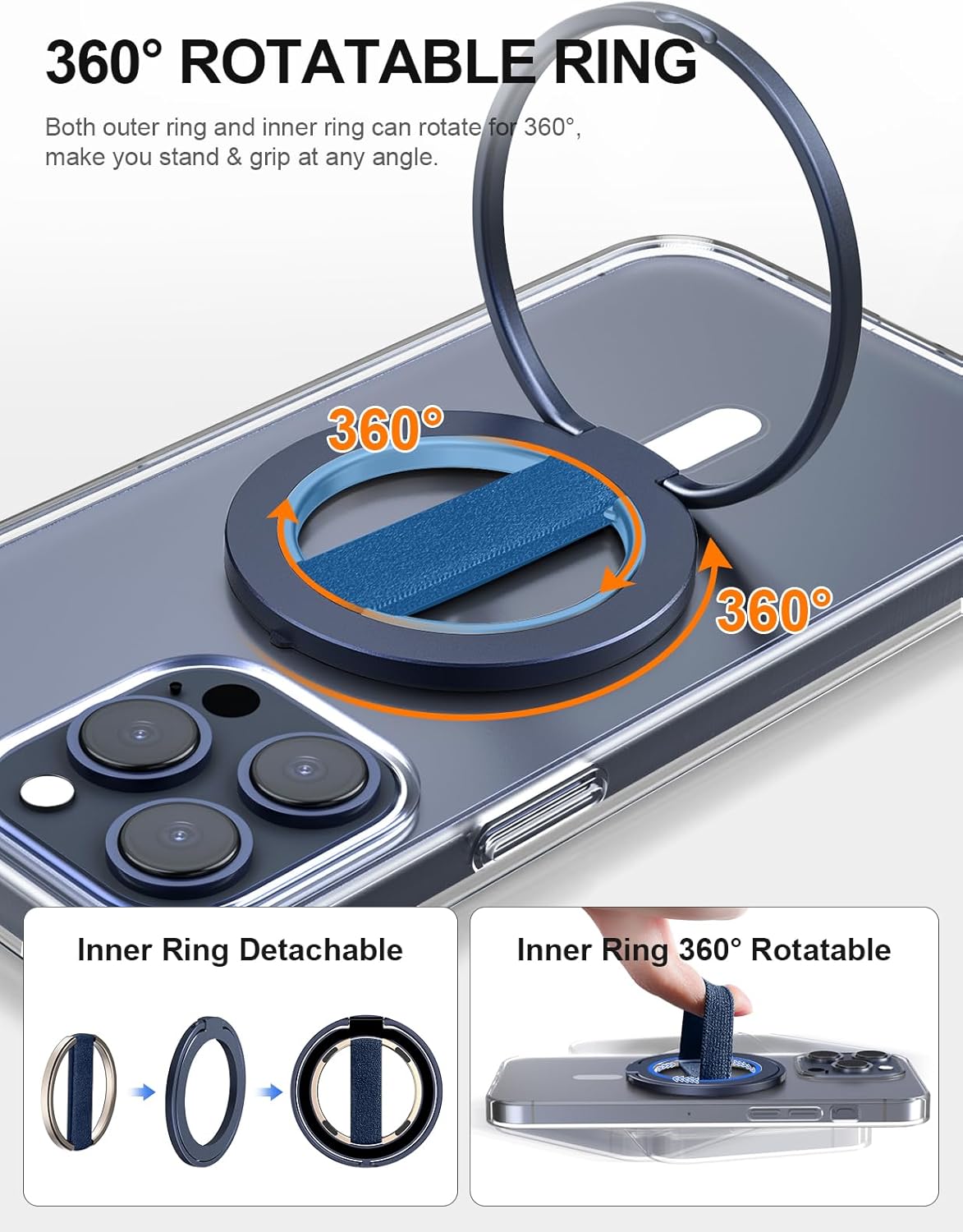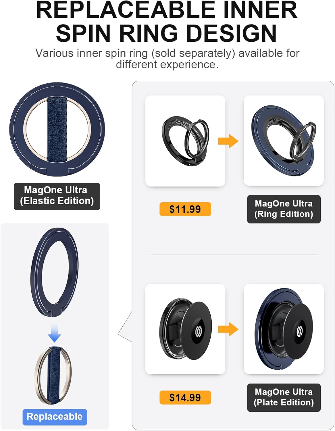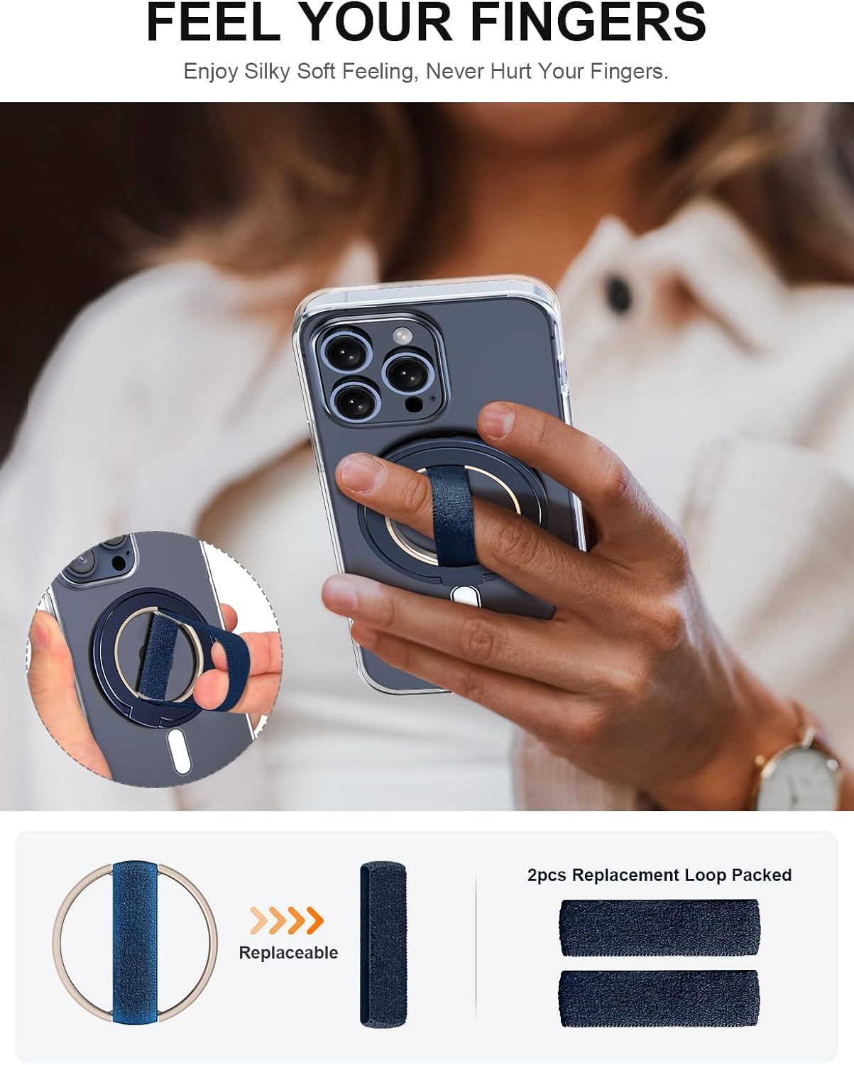 EWA MagOne Ultra Phone Grip Stand with Replaceable Elastic Finger Loop & Metal Inner Ring Grip, Removable Magnetic Ring Holder Kickstand Loop, Double-Sided Magnetic Accessories for iPhone 15, 14, 13 Pro/Max/Plus-Blue