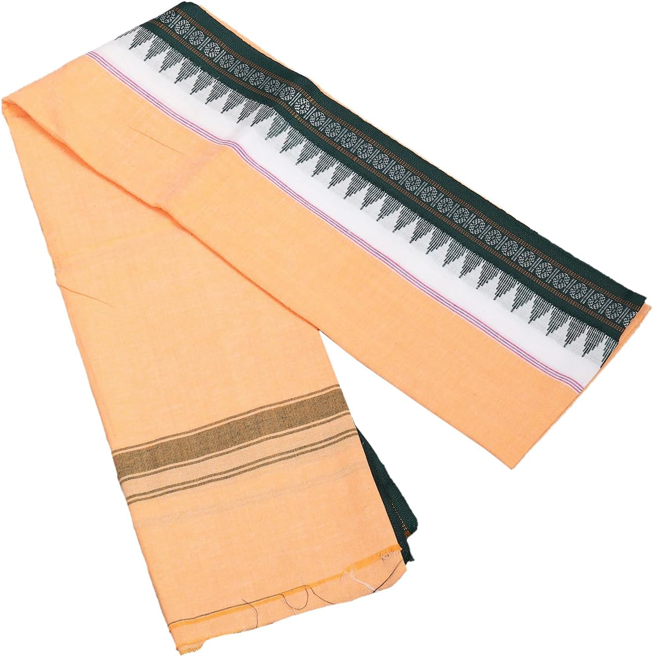 This Angavastram is crafted from pure cotton, ensuring a lightweight and breathable feel that's perfect for warm weather or layering. The fabric is carefully woven to provide a soft and comfortable drape. The detailed threadwork showcases the intricate temple and rudraksha motifs. These designs, deeply rooted in Indian tradition, lend a spiritual and aesthetically pleasing dimension to the piece. Notice the precision and dedication with which each motif is brought to life, a hallmark of Sambalpuri weaving. The borders are meticulously crafted to provide a distinct and refined finish.
