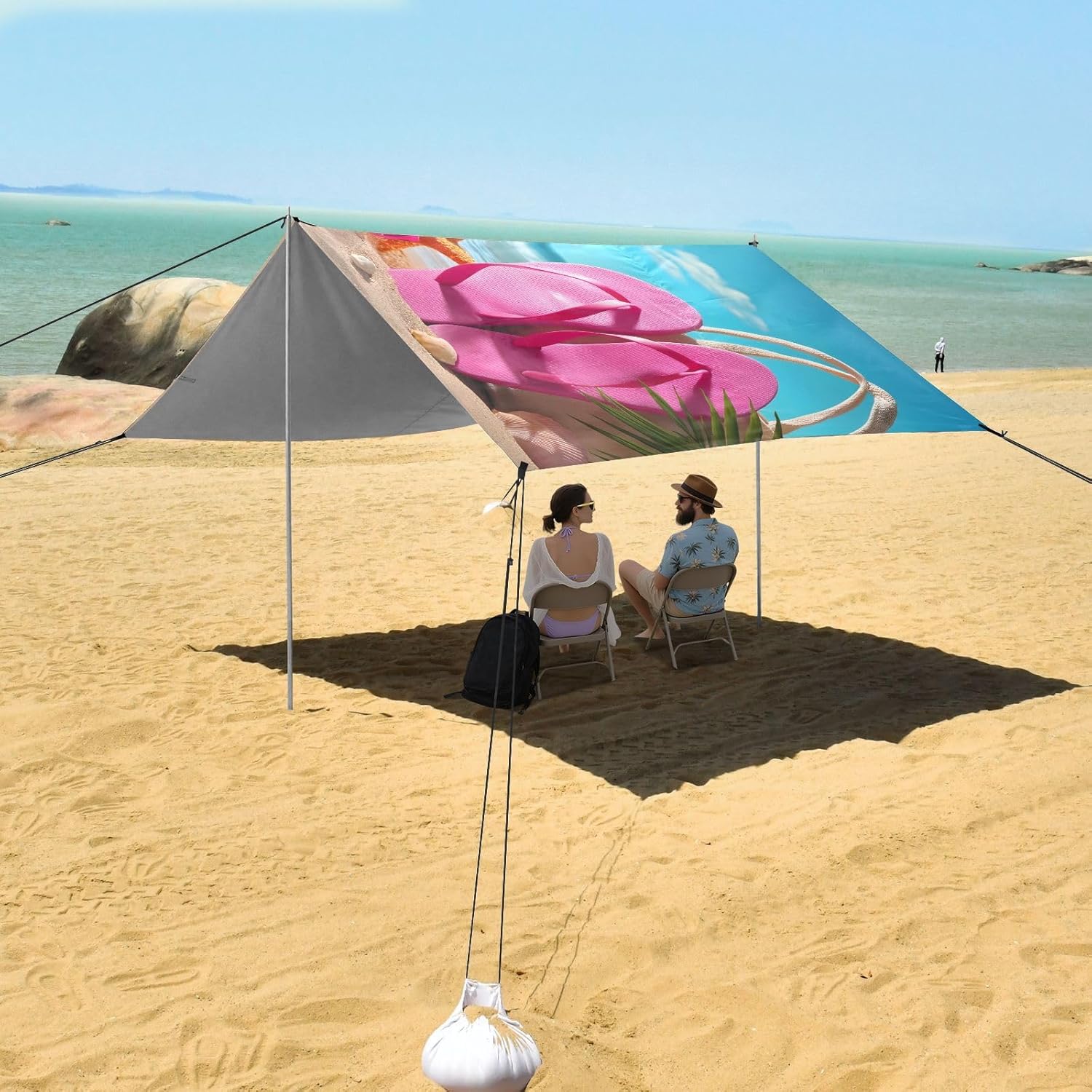 Unpack Cooling trip in 10 minutes! Our 280x320cm beach tent features silver-coated polyester oxford fabric that actively deflects heat while providing UPF 50+ protection-say goodbye to sunburns and squinting! Express your style with eye-catching, tropical-inspired prints that transform ordinary shade into a vibrant oasis. Engineered for stubborn coastal winds, the reinforced frame supports extra guy ropes alongside the included 4 refillable sandbags (use the free shovel!), 4 heavy-duty steel stakes, and 4 reinforced ropes. This high-grade anchoring system laughs at 25mph gusts while you relax. Adventure Beyond Sand: Beach lounging Lakeside camping Park picnics Fishing trips Festival hangouts Backyard "staycations