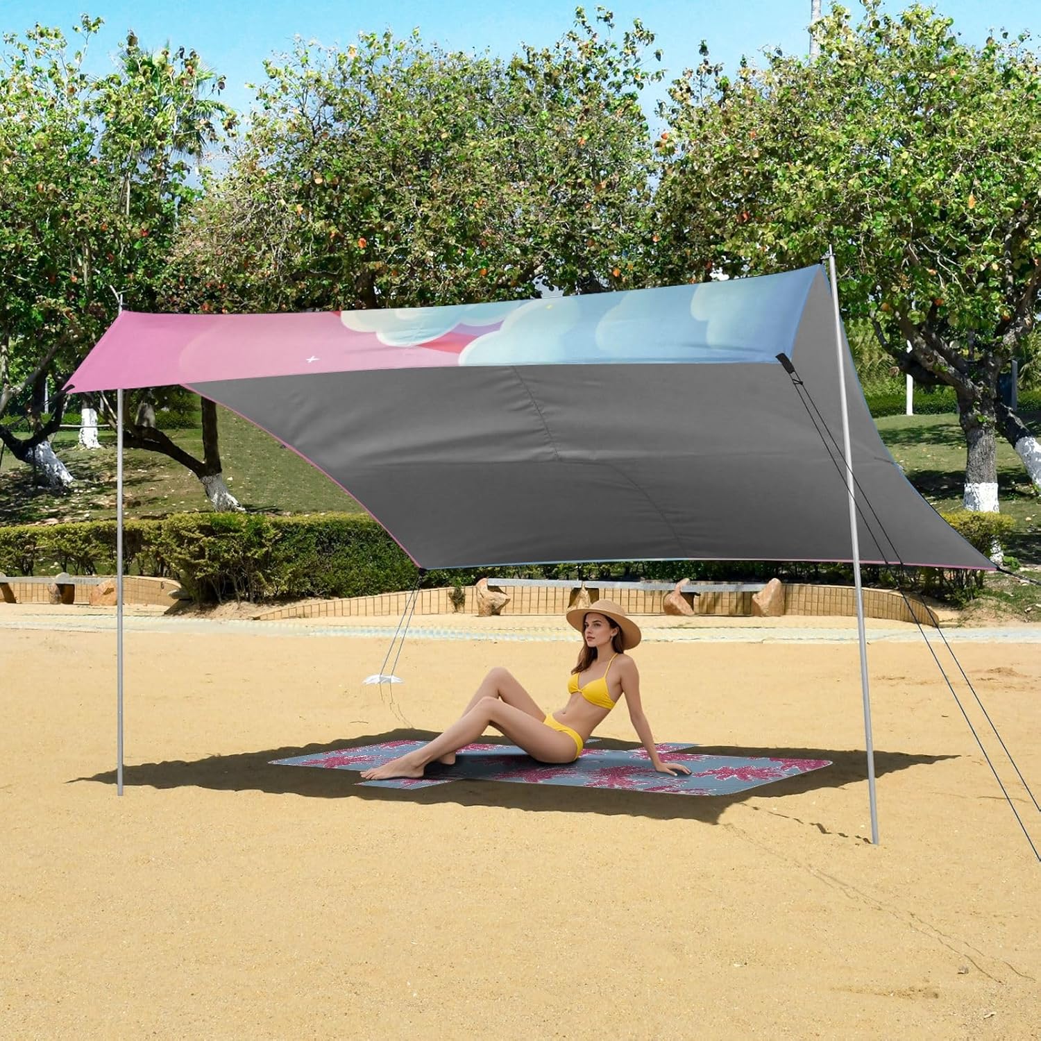 Unpack Cooling trip in 10 minutes! Our 280x320cm beach tent features silver-coated polyester oxford fabric that actively deflects heat while providing UPF 50+ protection-say goodbye to sunburns and squinting! Express your style with eye-catching, tropical-inspired prints that transform ordinary shade into a vibrant oasis. Engineered for stubborn coastal winds, the reinforced frame supports extra guy ropes alongside the included 4 refillable sandbags (use the free shovel!), 4 heavy-duty steel stakes, and 4 reinforced ropes. This high-grade anchoring system laughs at 25mph gusts while you relax. Adventure Beyond Sand: Beach lounging Lakeside camping Park picnics Fishing trips Festival hangouts Backyard "staycations
