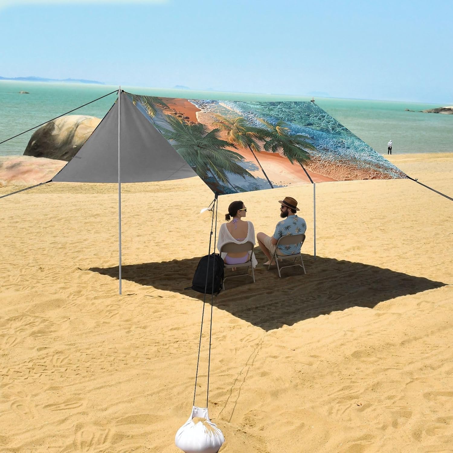 Unpack Cooling trip in 10 minutes! Our 280x320cm beach tent features silver-coated polyester oxford fabric that actively deflects heat while providing UPF 50+ protection-say goodbye to sunburns and squinting! Express your style with eye-catching, tropical-inspired prints that transform ordinary shade into a vibrant oasis. Engineered for stubborn coastal winds, the reinforced frame supports extra guy ropes alongside the included 4 refillable sandbags (use the free shovel!), 4 heavy-duty steel stakes, and 4 reinforced ropes. This high-grade anchoring system laughs at 25mph gusts while you relax. Adventure Beyond Sand: Beach lounging Lakeside camping Park picnics Fishing trips Festival hangouts Backyard "staycations