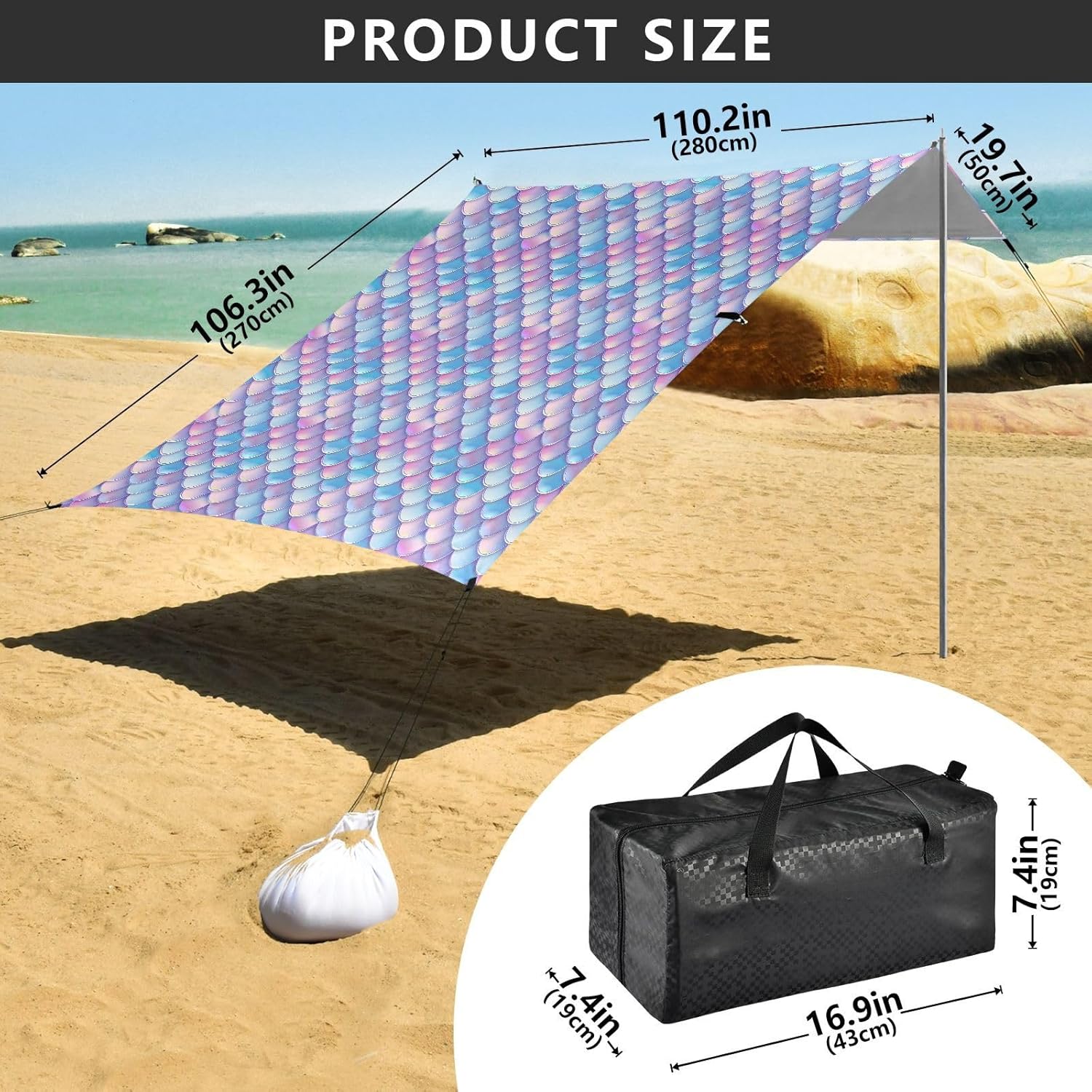 Unpack Cooling trip in 10 minutes! Our 280x320cm beach tent features silver-coated polyester oxford fabric that actively deflects heat while providing UPF 50+ protection-say goodbye to sunburns and squinting! Express your style with eye-catching, tropical-inspired prints that transform ordinary shade into a vibrant oasis. Engineered for stubborn coastal winds, the reinforced frame supports extra guy ropes alongside the included 4 refillable sandbags (use the free shovel!), 4 heavy-duty steel stakes, and 4 reinforced ropes. This high-grade anchoring system laughs at 25mph gusts while you relax. Adventure Beyond Sand: Beach lounging Lakeside camping Park picnics Fishing trips Festival hangouts Backyard "staycations