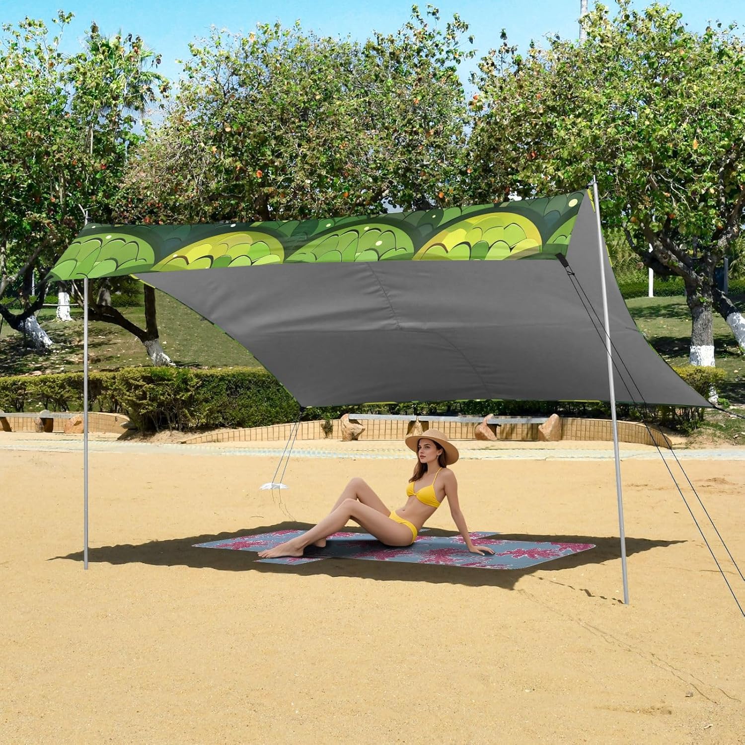 Unpack Cooling trip in 10 minutes! Our 280x320cm beach tent features silver-coated polyester oxford fabric that actively deflects heat while providing UPF 50+ protection-say goodbye to sunburns and squinting! Express your style with eye-catching, tropical-inspired prints that transform ordinary shade into a vibrant oasis. Engineered for stubborn coastal winds, the reinforced frame supports extra guy ropes alongside the included 4 refillable sandbags (use the free shovel!), 4 heavy-duty steel stakes, and 4 reinforced ropes. This high-grade anchoring system laughs at 25mph gusts while you relax. Adventure Beyond Sand: Beach lounging Lakeside camping Park picnics Fishing trips Festival hangouts Backyard "staycations