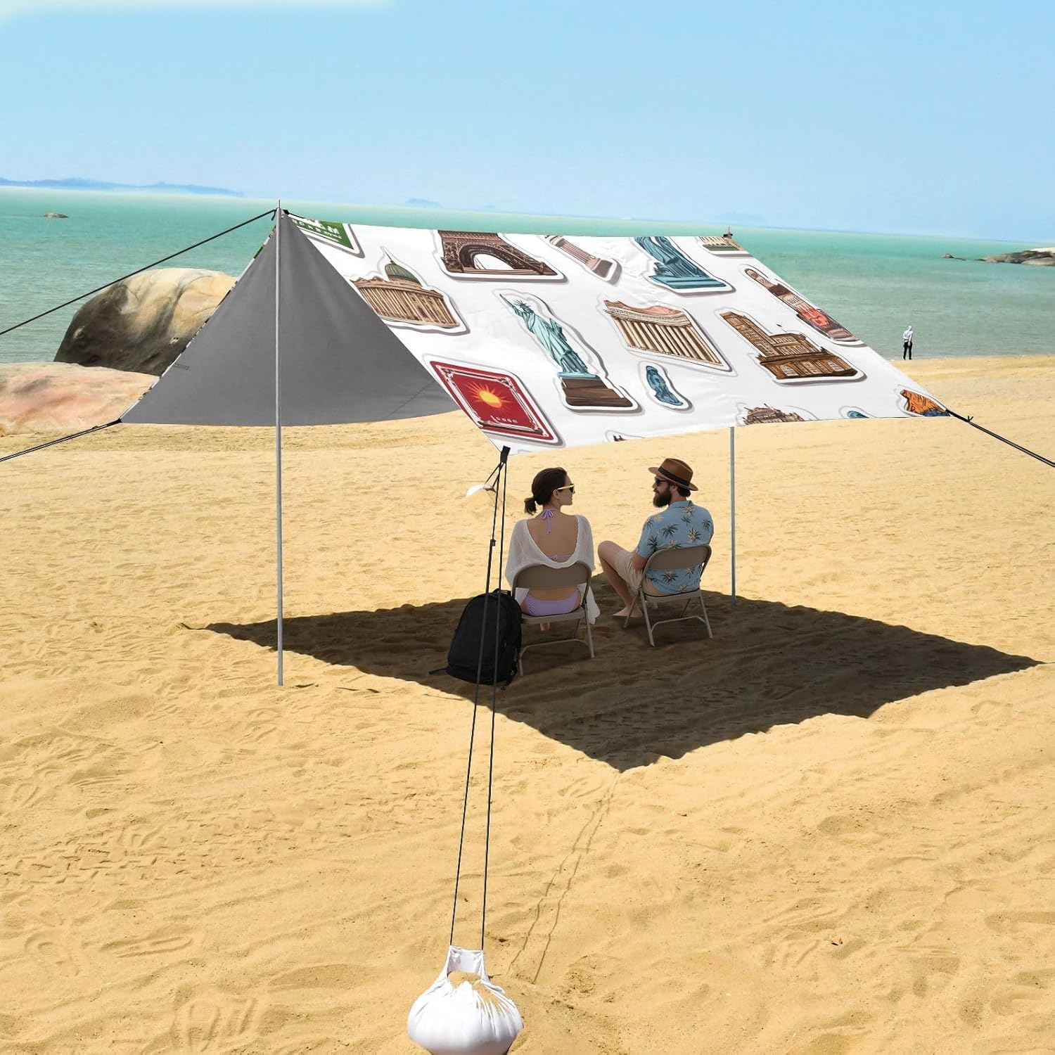 Unpack Cooling trip in 10 minutes! Our 280x320cm beach tent features silver-coated polyester oxford fabric that actively deflects heat while providing UPF 50+ protection-say goodbye to sunburns and squinting! Express your style with eye-catching, tropical-inspired prints that transform ordinary shade into a vibrant oasis. Engineered for stubborn coastal winds, the reinforced frame supports extra guy ropes alongside the included 4 refillable sandbags (use the free shovel!), 4 heavy-duty steel stakes, and 4 reinforced ropes. This high-grade anchoring system laughs at 25mph gusts while you relax. Adventure Beyond Sand: Beach lounging Lakeside camping Park picnics Fishing trips Festival hangouts Backyard "staycations