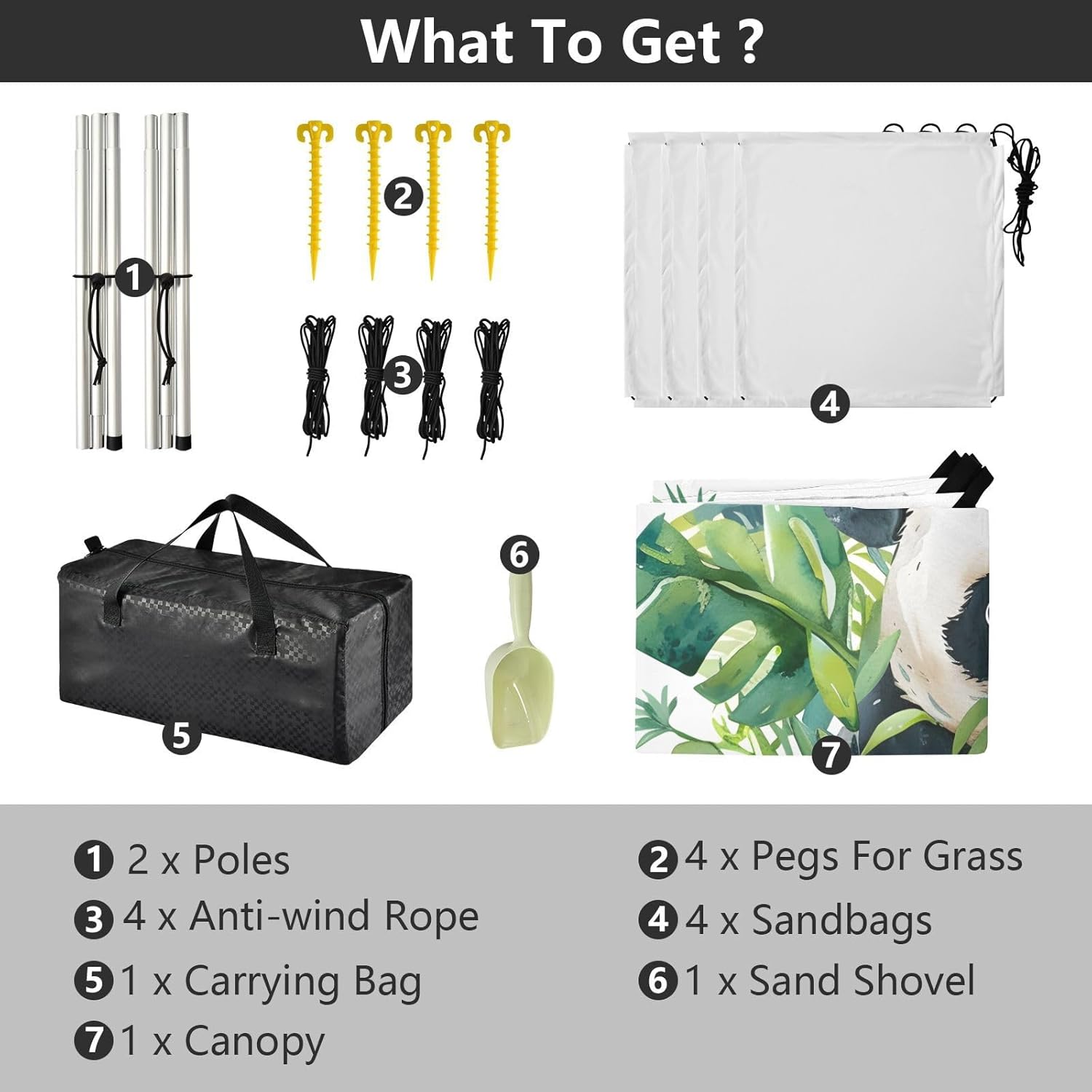 Unpack Cooling trip in 10 minutes! Our 280x320cm beach tent features silver-coated polyester oxford fabric that actively deflects heat while providing UPF 50+ protection-say goodbye to sunburns and squinting! Express your style with eye-catching, tropical-inspired prints that transform ordinary shade into a vibrant oasis. Engineered for stubborn coastal winds, the reinforced frame supports extra guy ropes alongside the included 4 refillable sandbags (use the free shovel!), 4 heavy-duty steel stakes, and 4 reinforced ropes. This high-grade anchoring system laughs at 25mph gusts while you relax. Adventure Beyond Sand: Beach lounging Lakeside camping Park picnics Fishing trips Festival hangouts Backyard "staycations