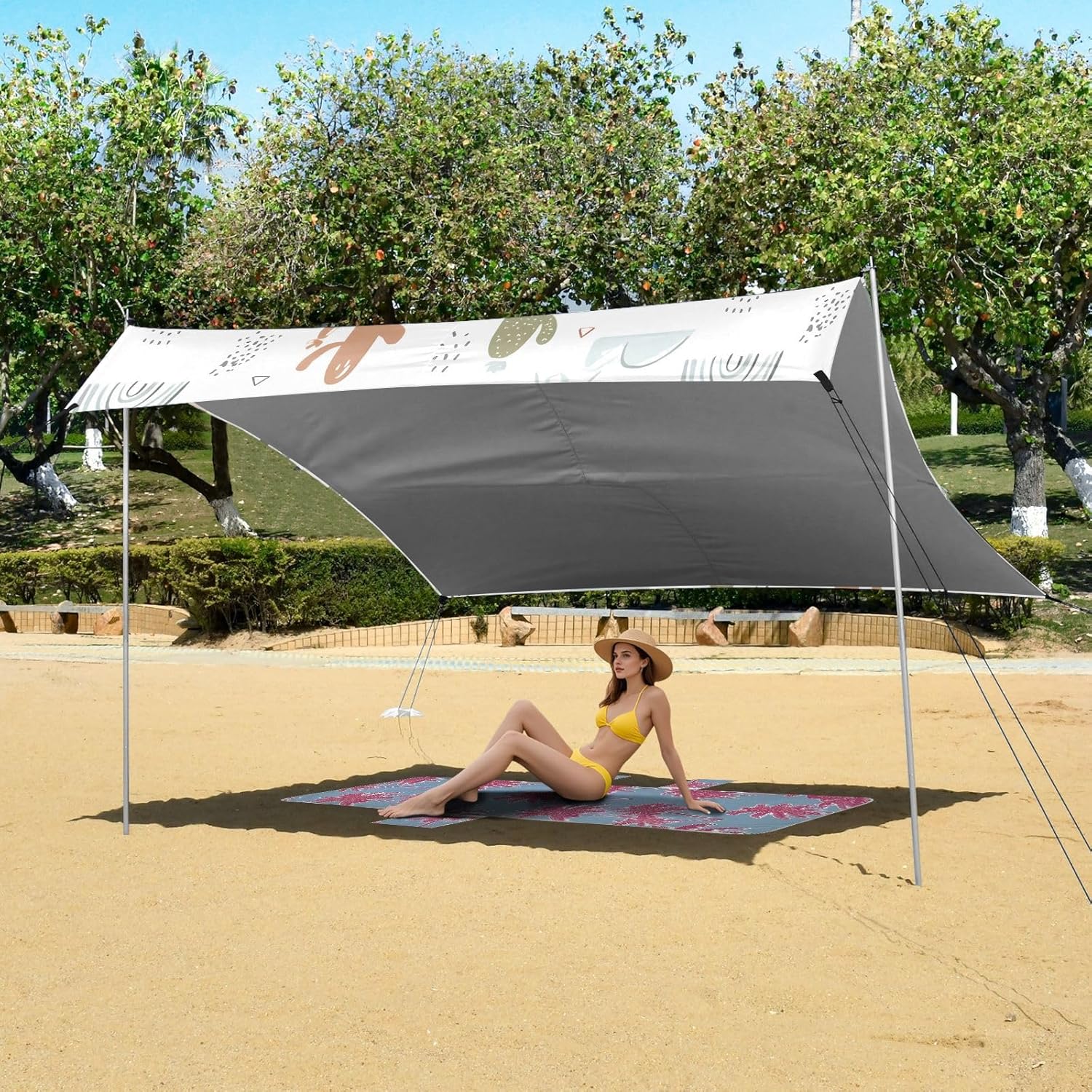 Unpack Cooling trip in 10 minutes! Our 280x320cm beach tent features silver-coated polyester oxford fabric that actively deflects heat while providing UPF 50+ protection-say goodbye to sunburns and squinting! Express your style with eye-catching, tropical-inspired prints that transform ordinary shade into a vibrant oasis. Engineered for stubborn coastal winds, the reinforced frame supports extra guy ropes alongside the included 4 refillable sandbags (use the free shovel!), 4 heavy-duty steel stakes, and 4 reinforced ropes. This high-grade anchoring system laughs at 25mph gusts while you relax. Adventure Beyond Sand: Beach lounging Lakeside camping Park picnics Fishing trips Festival hangouts Backyard "staycations