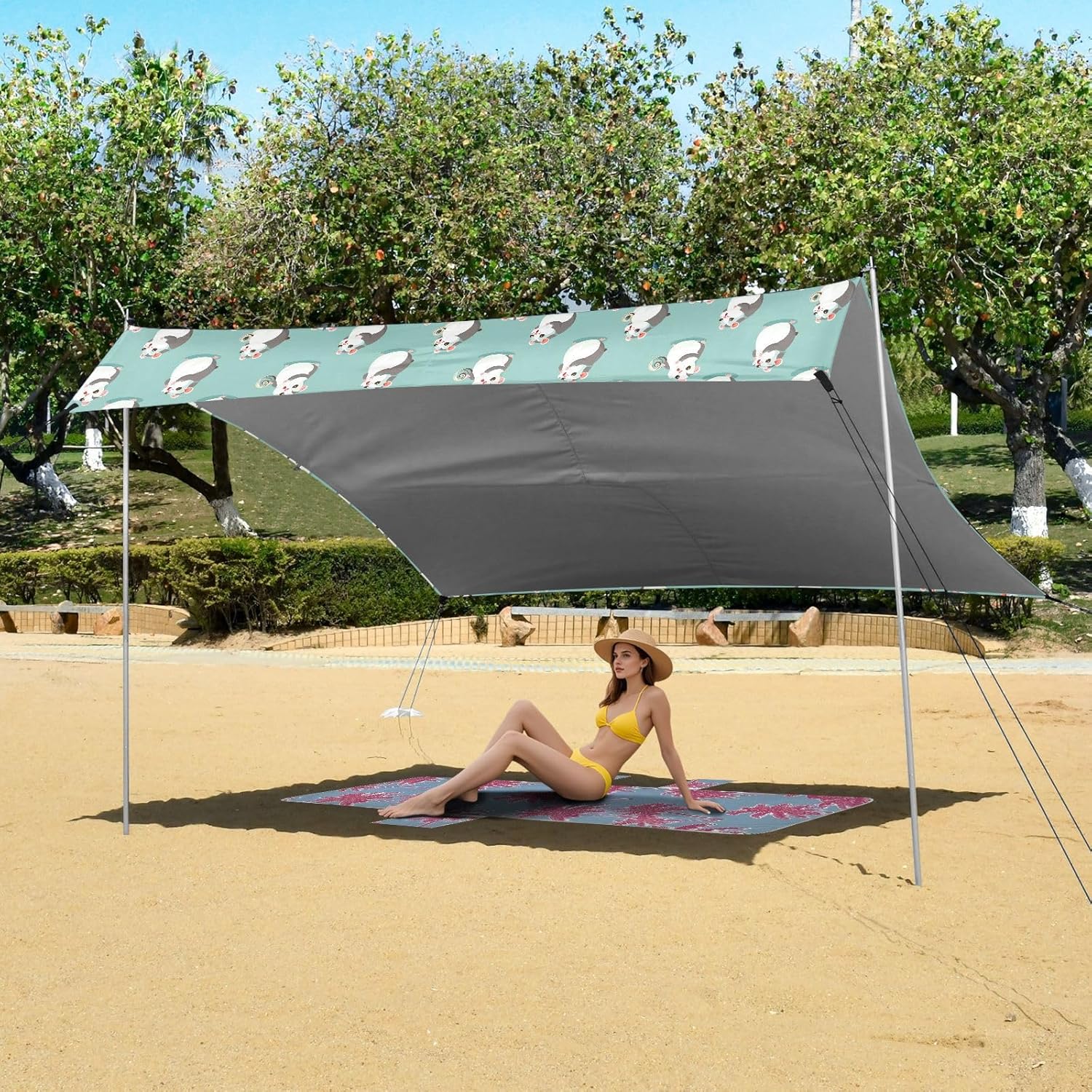 Unpack Cooling trip in 10 minutes! Our 280x320cm beach tent features silver-coated polyester oxford fabric that actively deflects heat while providing UPF 50+ protection-say goodbye to sunburns and squinting! Express your style with eye-catching, tropical-inspired prints that transform ordinary shade into a vibrant oasis. Engineered for stubborn coastal winds, the reinforced frame supports extra guy ropes alongside the included 4 refillable sandbags (use the free shovel!), 4 heavy-duty steel stakes, and 4 reinforced ropes. This high-grade anchoring system laughs at 25mph gusts while you relax. Adventure Beyond Sand: Beach lounging Lakeside camping Park picnics Fishing trips Festival hangouts Backyard "staycations