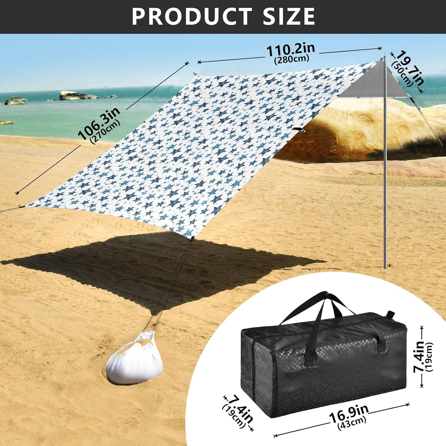 Unpack Cooling trip in 10 minutes! Our 280x320cm beach tent features silver-coated polyester oxford fabric that actively deflects heat while providing UPF 50+ protection-say goodbye to sunburns and squinting! Express your style with eye-catching, tropical-inspired prints that transform ordinary shade into a vibrant oasis. Engineered for stubborn coastal winds, the reinforced frame supports extra guy ropes alongside the included 4 refillable sandbags (use the free shovel!), 4 heavy-duty steel stakes, and 4 reinforced ropes. This high-grade anchoring system laughs at 25mph gusts while you relax. Adventure Beyond Sand: Beach lounging Lakeside camping Park picnics Fishing trips Festival hangouts Backyard "staycations