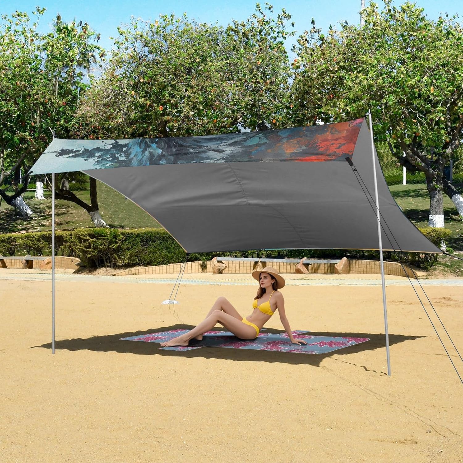 Unpack Cooling trip in 10 minutes! Our 280x320cm beach tent features silver-coated polyester oxford fabric that actively deflects heat while providing UPF 50+ protection-say goodbye to sunburns and squinting! Express your style with eye-catching, tropical-inspired prints that transform ordinary shade into a vibrant oasis. Engineered for stubborn coastal winds, the reinforced frame supports extra guy ropes alongside the included 4 refillable sandbags (use the free shovel!), 4 heavy-duty steel stakes, and 4 reinforced ropes. This high-grade anchoring system laughs at 25mph gusts while you relax. Adventure Beyond Sand: Beach lounging Lakeside camping Park picnics Fishing trips Festival hangouts Backyard "staycations