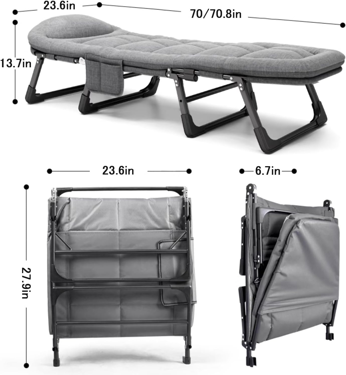 Product SpecificationsProduct Name: camping cots for adults/foldable cot/portable cotMattress Material: Cotton and Linen + High Elastic SpongeBracket Material: SteelProduct Length: 170/180cmProduct Width: 61cmProduct Height: 35cmFolding Size: 60x17x71CM/65x17x75CMLoad Capacity: 400LBS/200KGPlease Note:1. Due to the display environment, the color of the photo may be slightly different from the actual product.2. Due to different testing methods, the product size may have an error of 1-3cm.