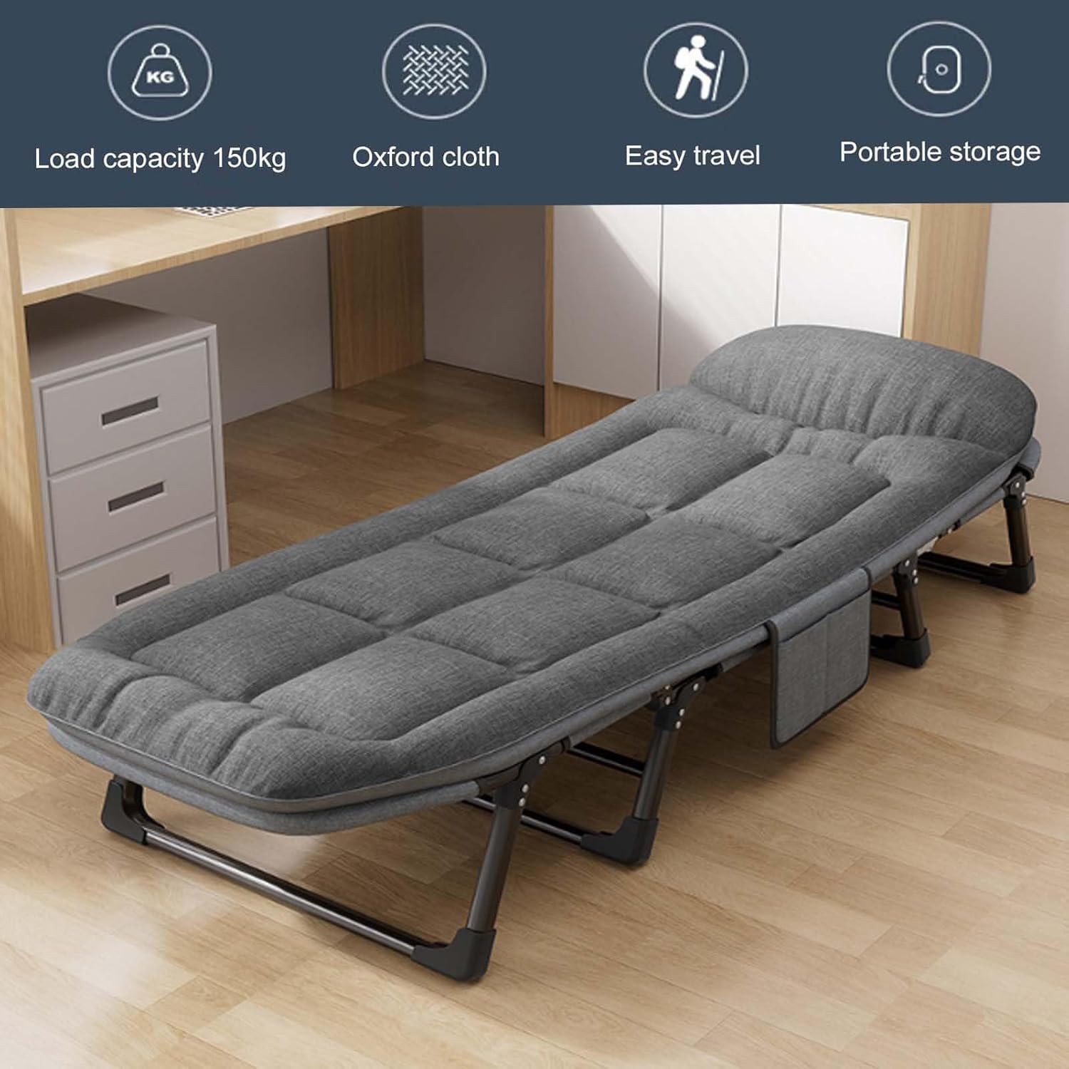 Folding Lightweight Bed,Sleeping Cots Specification Color: Grey Size: 190x66x35cm/200x66x35cm Material: Metal+Oxford cloth Product Description The bottom 8 foot support structures provide more stable load-bearing, and the bed surface is uniformly stressed, allowing for free flipping anytime, anywhere Multi level adjustable height, reliable sitting, sleeping and lying, meeting different needs High elastic cotton filling that fits the curves of the human body and effectively relaxes the muscles of the head and neck No installation required, simple and lightweight operation, can be unfolded or stored in just a few steps What You Get 1x Camping cot