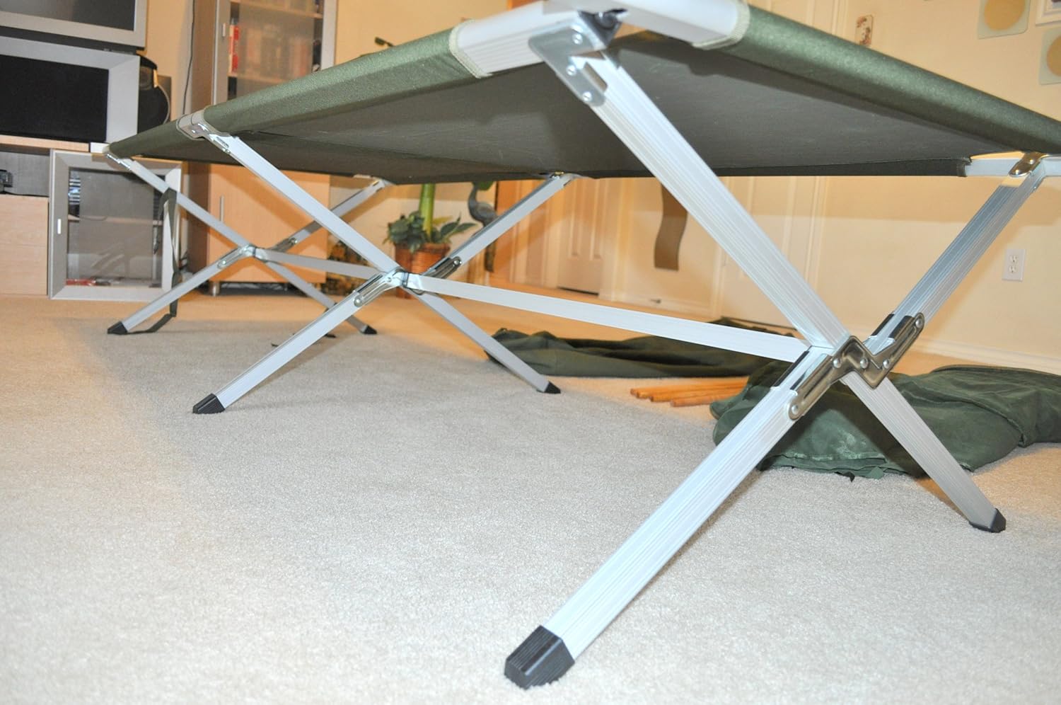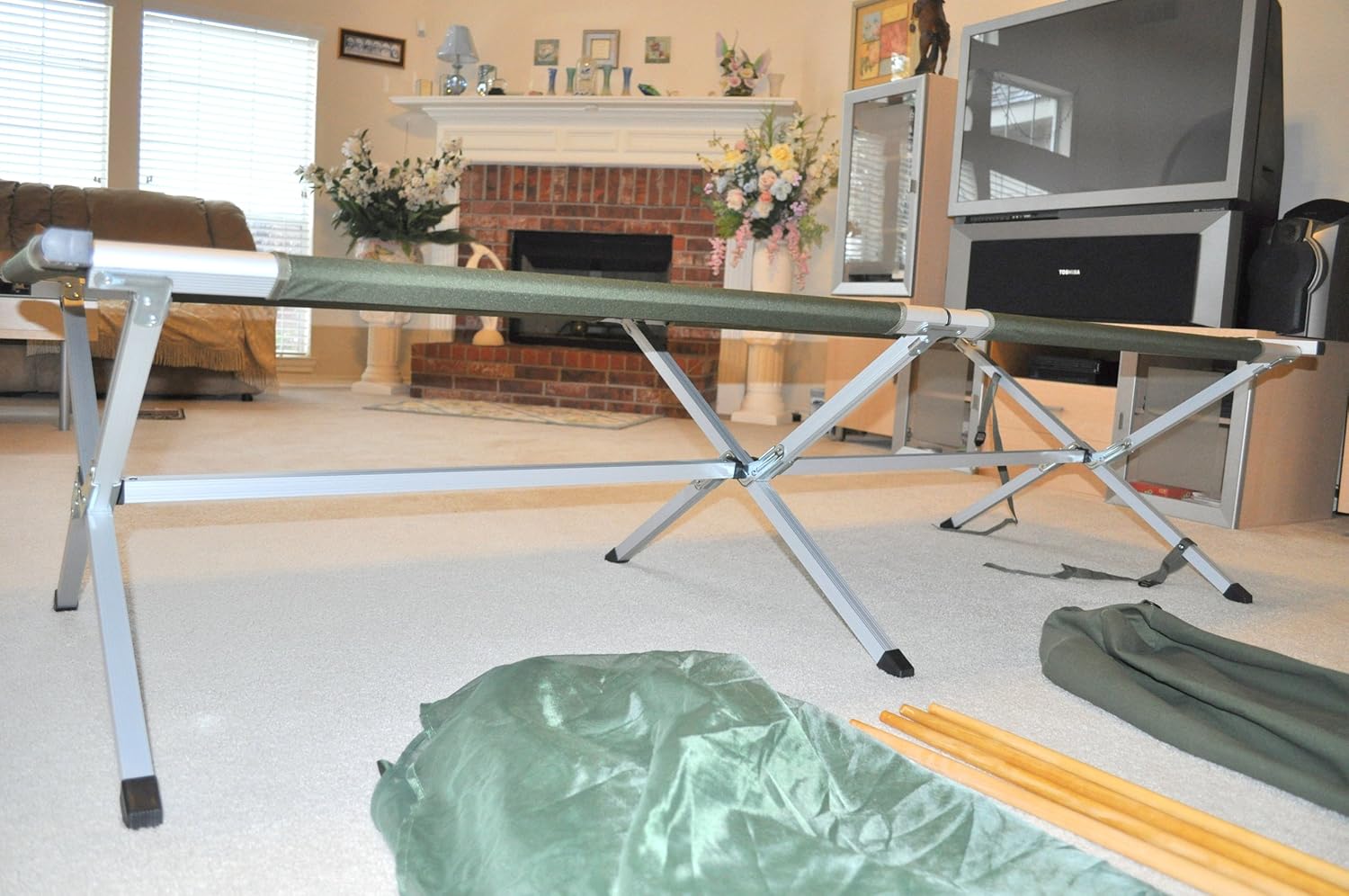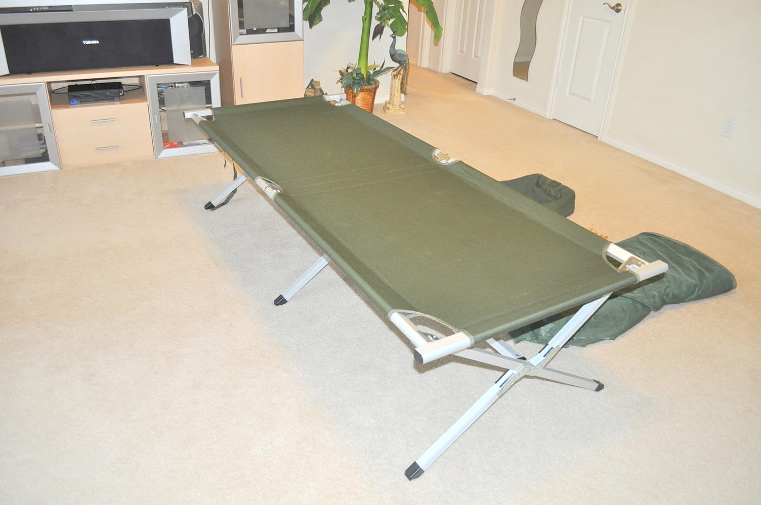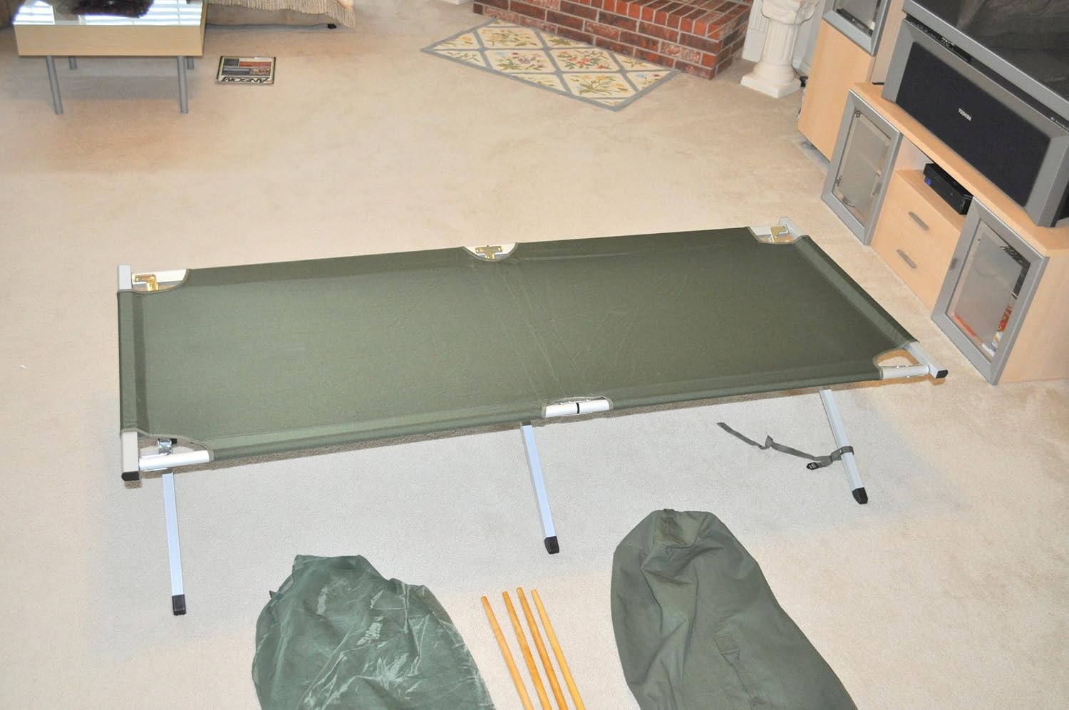 This G.I. US Military Folding Cot is the latest in the line of military cots. It features a longer width than the previous GI cot, so there is extra space and added comfort. It is also stronger as there are extra bars underneath, allowing for more weight support. Cot will come in a heavy duty GI OD duffle bag w/ mosquito netting and 4 wooden stakes.