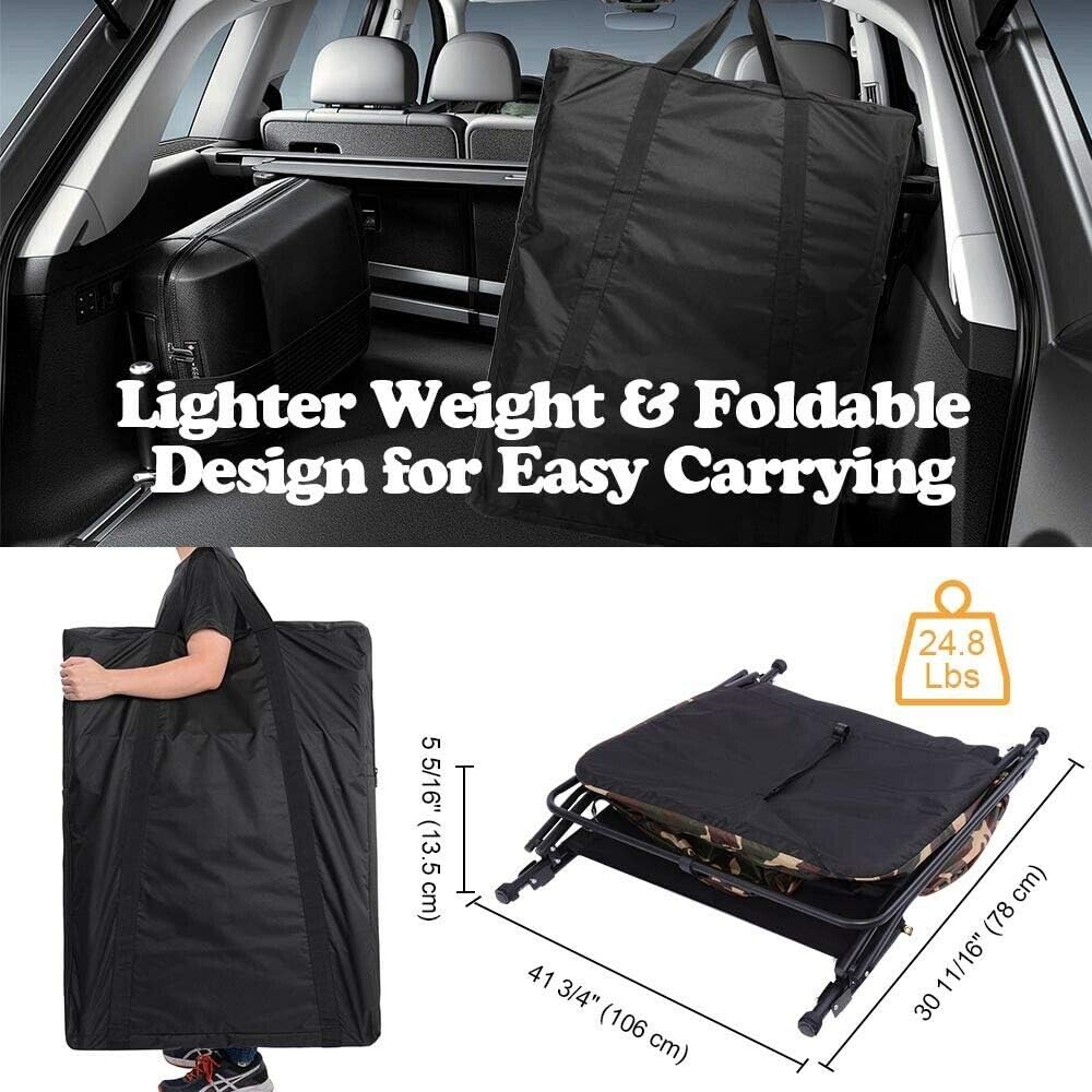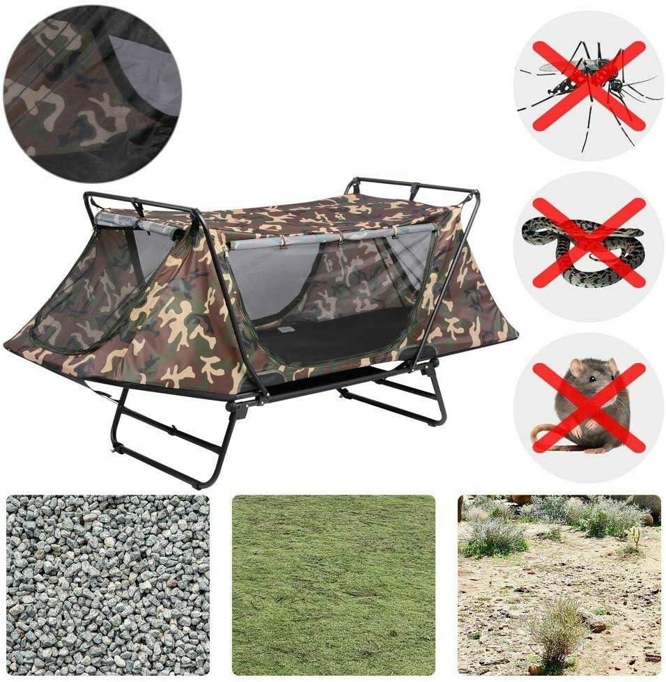 Athena Supply Company Portable Single Cot Waterproof Hiking Bed Bag Camo Features: Fast Folding & Easy Setup - Integrated single tent cot, can be easily set up in minutes, just unfold the frame & adjust the top attached to it, makes various camping easier Large Space & Safe Protection - 84 1/4" x 28 3/4" bed offers an ample space for a sound sleep & enough underbed space for holding objects; 12" above ground protects from rocks, any ground animals, and dampness, enhancing your sleeping level while enjoying the outdoors Sturdy Construction & Waterproof Fabric -600D polyester fabric bottom & 190T polyester top & 190T oxford rain fly, both with 2000mm PU coating for water-resistance and wear-resistance, ideal for wet weather conditions Air Ventilation & Practical Design: Blocking annoying bugs; Straps on the doors for hanging towels conveniently East Carrying - 25 lbs lightweight design and can be folded into small size of 41 3/4" x 30 11/16" x 5 5/16" and packed in the 600D oxford bag for easy transport Specifications: Unfolded Dimension (LxWxH): 84 1/4" x 31 1/2" x 40 9/16" (214 x 80 x 103 cm) Folded Dimension (LxWxH): 41 3/4" x 30 11/16" x 5 5/16" (106 x 78 x 13.5 cm) Bed Size(LxW): 84 1/4" x 28 3/4" (214 x 73 cm) Bed-to-top Height: 26 3/8" (67 cm) Under-bed Height: 11 13/16" (30 cm) Rain Fly Material: 190T Oxford Fabric with PU coating (PU2000mm) Tent Material: 190T Polyester Fabric with PU coating (PU2000mm), Top; 600DPolyester Fabric with PU coating (PU2000mm), Bottom; Metal; Aluminum Weight Capacity: 265 Lbs (120 kg)Net Weight: 24.7 Lbs (11.2 kg) Package Contents: 1x Tent Cot, 1x Rain Fly, 2x Rain Fly Supporting Poles,1x Oxford Bag, 2x Stakes, 2x Ropes,1x Manual