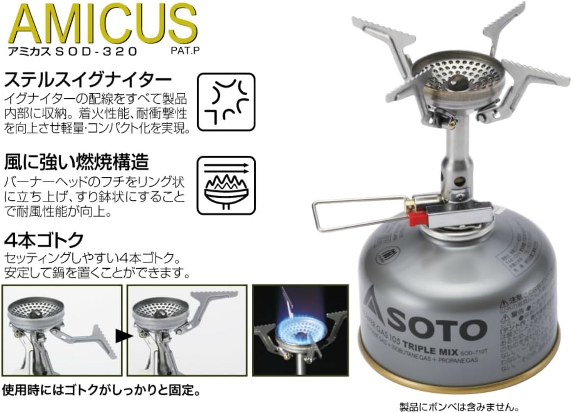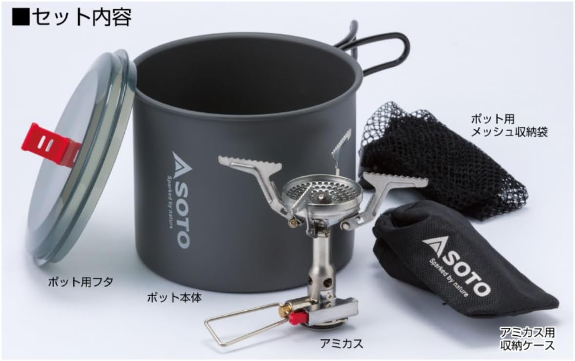 A value set of Amicus and New River Pot. Amicus is an excellent total balance of use and equipment. Suitable for use during auto camping and mountain trips. The borders of the burner head are launched into a ring and the mortar burner head structure improves wind resistance. Put the igniter's electrical circuit inside the product. Improved ignition performance and impact resistance, making it lightweight and compact. Uses 4 pieces that are easy to set up. Stable to hold pots This model is not equipped with a micro regulator. Set Includes: Amicus (SOD-320), New River Pot, Storage Bag.