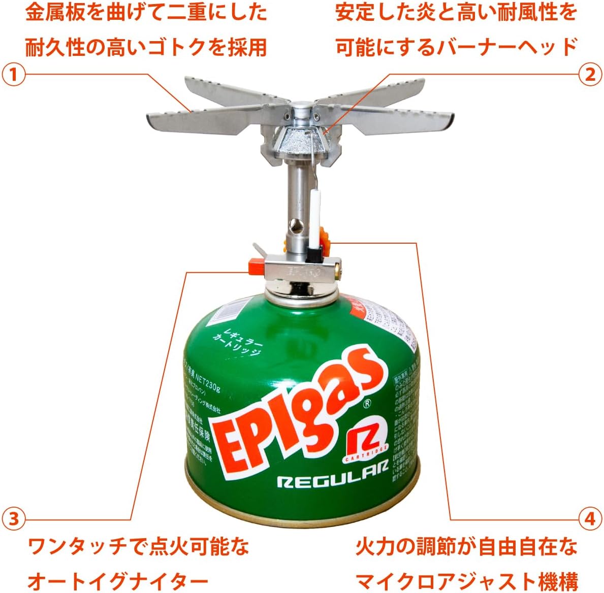 This is an EPIgas flagship model that uses the new material "S.F.P.M". The burner head uses the new material "S.F.P.M. (Sintered Fiber Porous Metal)" - Sintered Fiber Porous Metal. The burner head material "S.F.P.M" has been heated and compressed at a constant density, creating the ideal flame density you never achieved. Unlike conventional flames that drill holes in metal, this product has a small burner head that has many tiny flames, so it achieves a high fire power of 3,700 kcal despite its compact burner head. In addition, by suppressing gas release and burning surface with the burner head, it reduces lifting (where there is a layer of gas on the burner head surface and the flame rise), making it extremely wind resistant as if a flame is coming from the burner head. Micro adjustment mechanism allows for even the smallest scales. Automatic ignition device included. Depending on the conditions of use, it may be difficult to ignite. Made in Japan