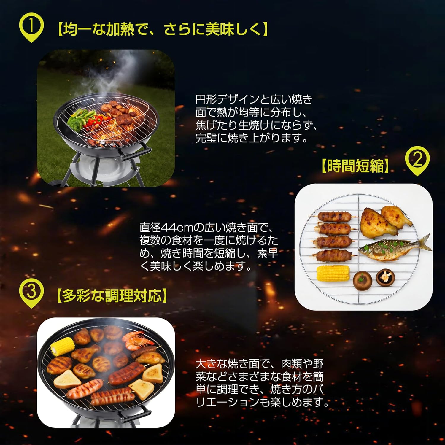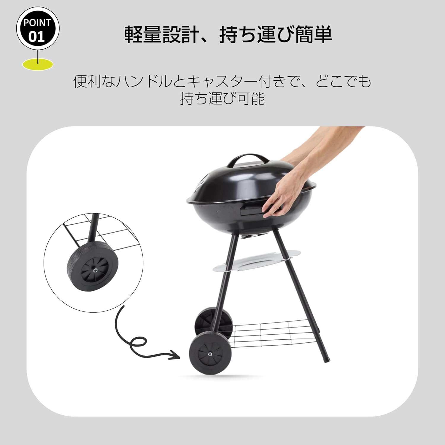 Lightweight design makes it easy to carry, with convenient handles and casters, you can easily set up anywhere in the park, beach or garden. The 44cm diameter round grill has a large grill surface perfect for 4-8 people, even heating for delicious results and cooking more food at the same time, saving time. In addition, it can be used for a variety of cooking activities such as baking, smoking, and steaming. You can freely adjust the flame power through the vent, and it comes with an ash tray for easy cleanup. The bottom is equipped with a shelf that allows you to keep food and charcoal at your fingertips, making your outdoor barbecue experience more comfortable