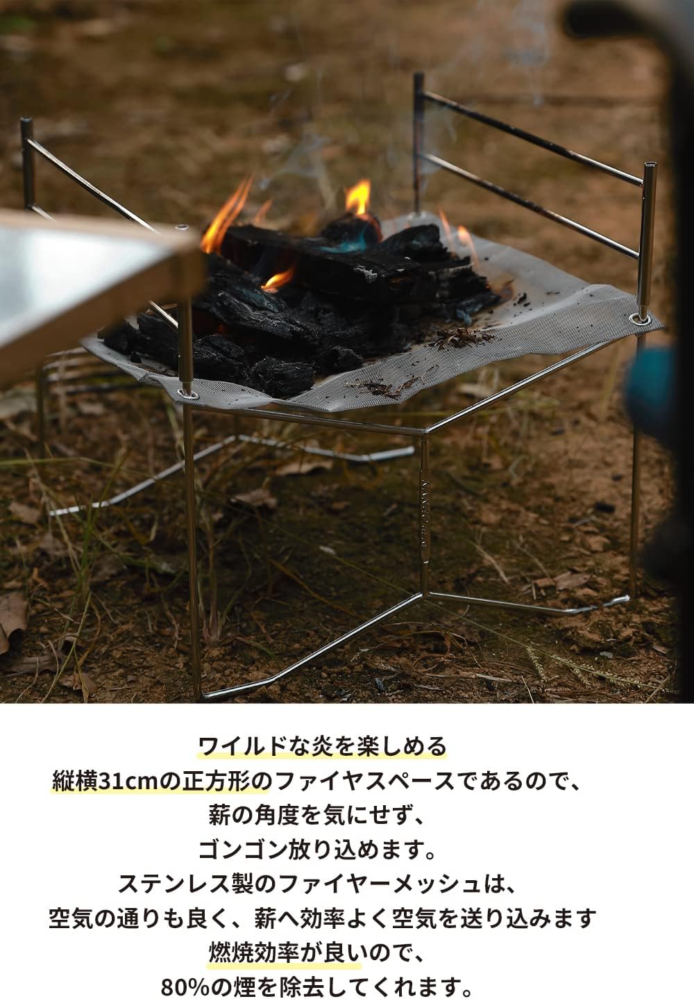 A multi-purpose bonfire stand and trivet set. Solo ~ Large B4 size for 3 people. The grate is made of stainless steel mesh that burns well. In addition, the mesh net uses SUS304 (18-8) that is rust resistant and can be used for a variety of purposes. Since it comes with a net type grid, it can be used as a stove for charcoal or bonfire. The trivet (1 piece) is made of approximately 1/3 the size of the bonfire surface and can be used in combinations. Of course, you can use it as a bonfire stand when you get rid of all of your items. The distance between the grate and the toke is adjustable in 2 levels, so you can cook wood while switching between strong and low heat. This bonfire stand is almost flat with no edges, making it ideal for people who want to see firewood or flames and enjoy fire-fidgeting. If you use it as a bonfire stand, it can also be placed on a long size firewood. However, when using it as a stove, please use a log that is thick enough to fit the upper and lower space. Although it is a mesh grace, it is made of a special heat resistant mesh with a fine texture, so the ash will not fall off underneath.