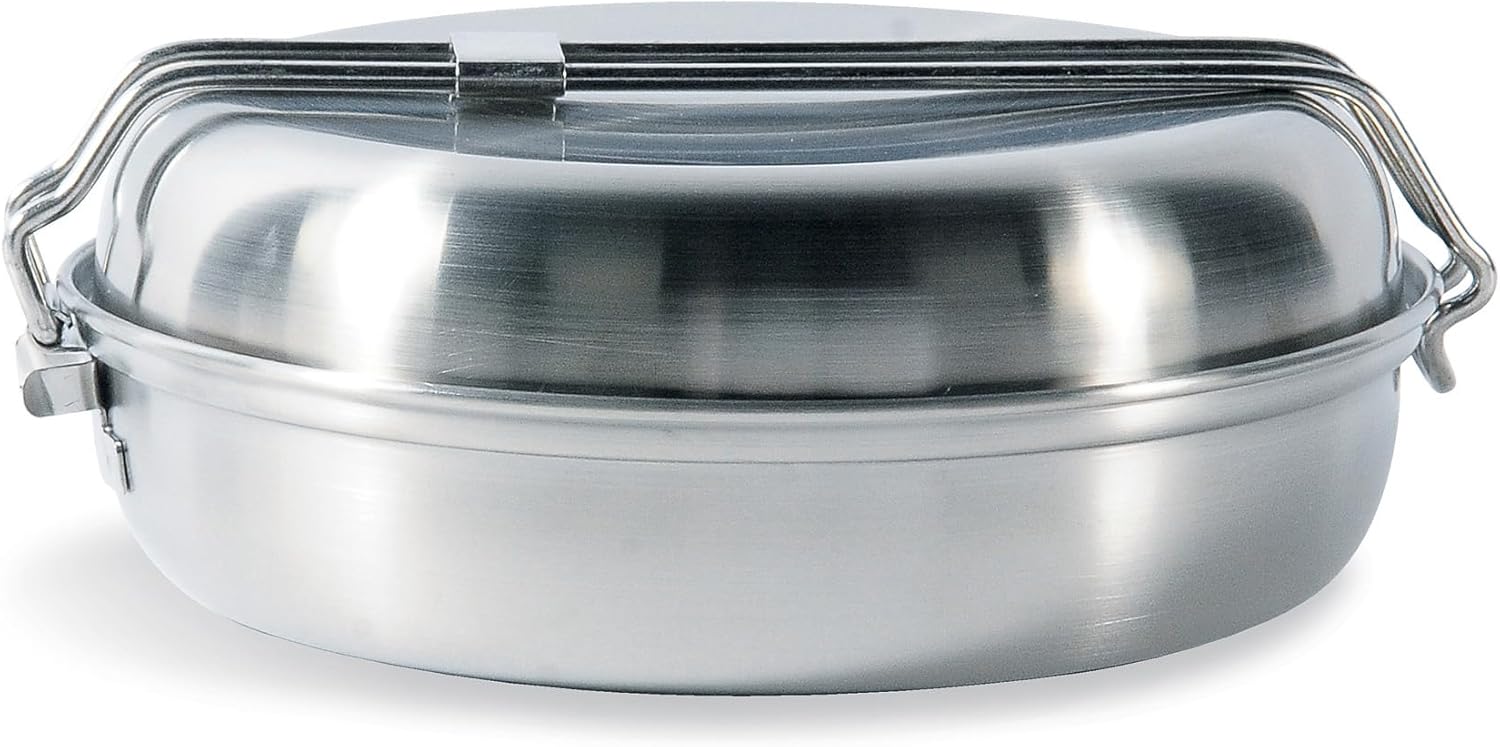 Camping kitchen equipment:Applicatioins: cookType: cooking & dinner setMaterial: stainless steelContent / delivery size: 1 pot with lid, 1 pan, 1 bowlSize:Weight: 495 gAdditional Information:stackable to save spacepack size: 17,3 x 6 cmbowl: 16,5 x 3 cm (100 g)