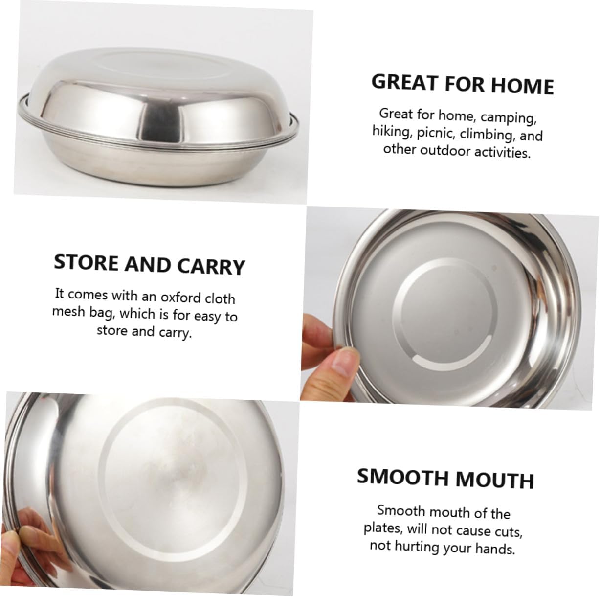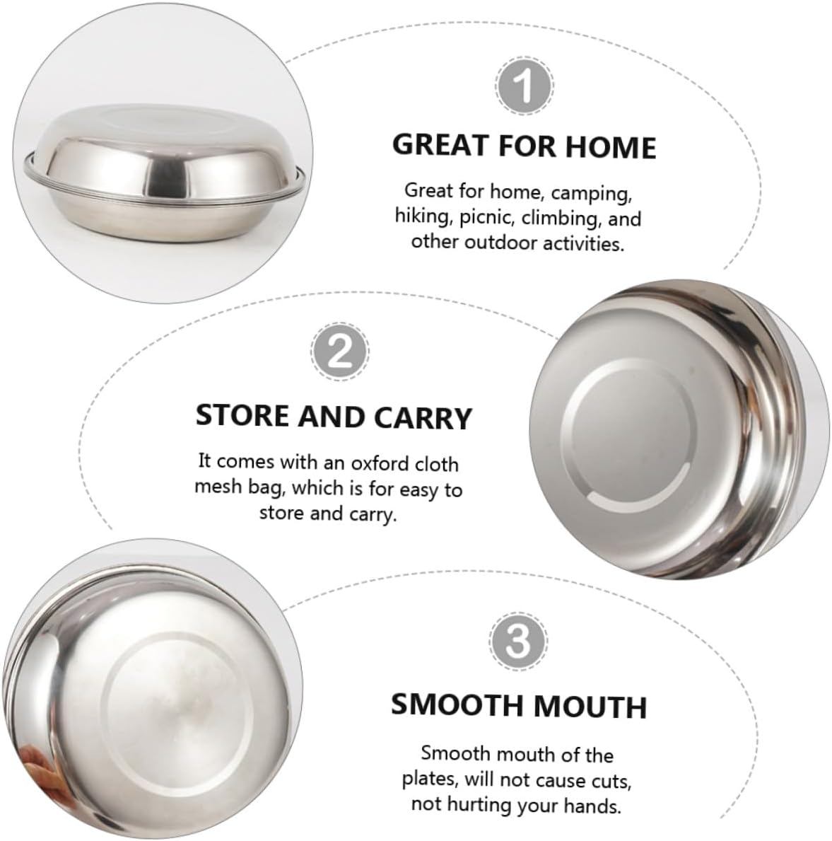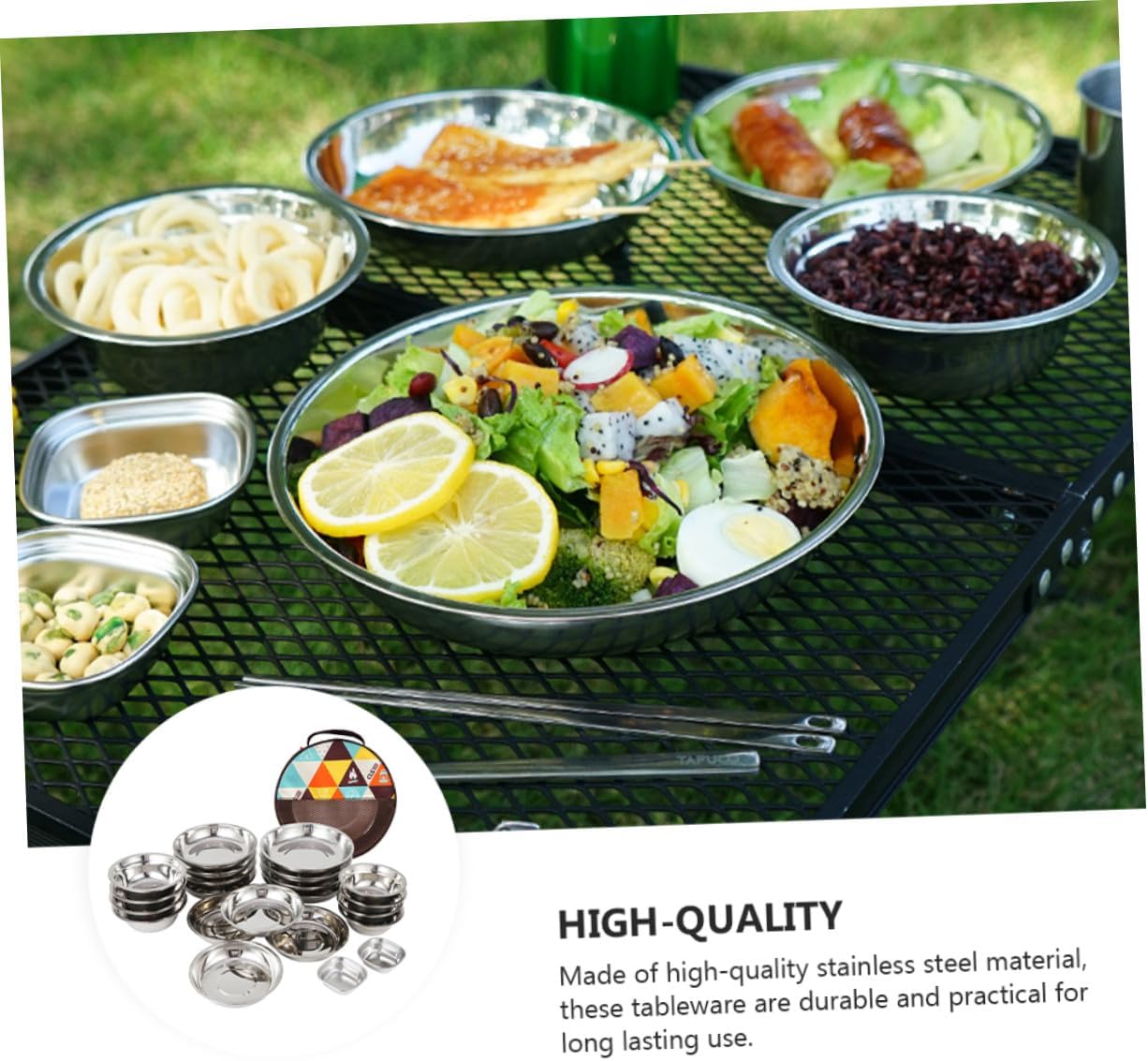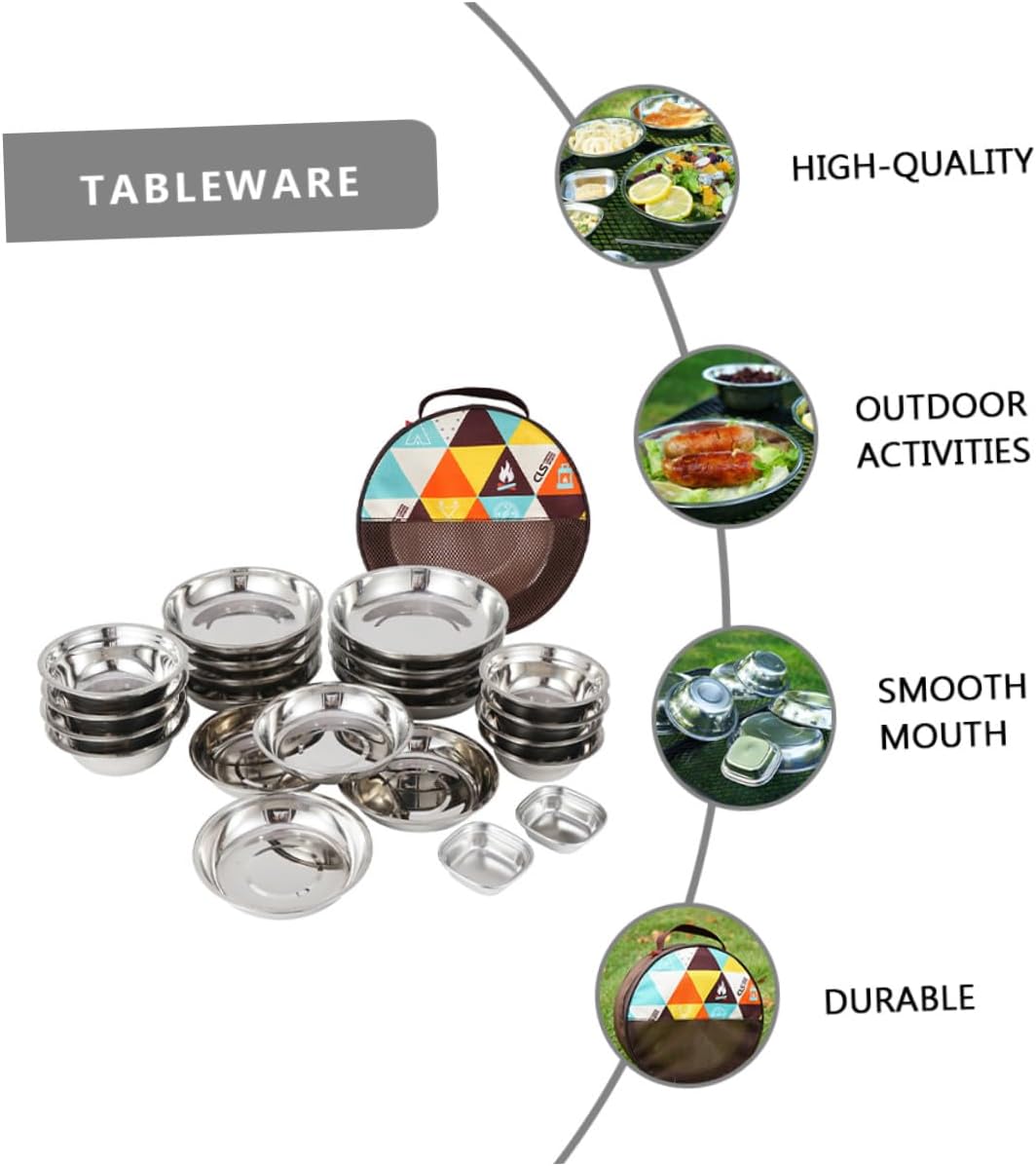 Package List 22 x soup bowl 1 x storage bag Characteristics -Product Info:Outdoor camping tableware set -Material:Stainless steel -Color:Assorted Color -Size: 23.00X23.00X8.00cm/9.04X9.04X3.14in -Made of stainless steel - highly durable and made to last Portable Camping Tableware. -Great for hiking, camping, picnics, or everyday use, safe and durable Picnic Plate Bowl. -You can have more than one dishes time using this full functional dinning set Outdoor Dinning Tools. -Good for outdoor dinning, beach parties, mountain trekking or BBQ in back yard or parks. -Tasteless, odorless, does not corrode or rust, is non-allergenic.Goods DescriptionPortable Camping Tableware Lightweight to prevent feeling the weight within the bag on your back.Outdoor Tableware This dinning kit is designed for a large group people and comes with your table plates, for camping, backpacking, picnics and other outdoor activities.Outdoor Dinning Tools All are healthy to your body