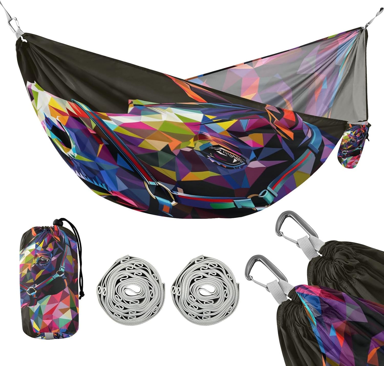 Reliable Outdoor Relaxation This practical hammock delivers comfort and convenience for outdoor enthusiasts using quality materials and thoughtful engineering. Technical Details Material: 100% polyester (210T taffeta body; 600D polyester straps) Hardware: Aluminum carabiners Load Capacity: 500 lbs (227 kg) Packed Size: Approx. 7 x 5 inches (18 x 13 cm) Durable Construction Reinforced triple-stitched seams at stress points Quick-drying material Practical Applications Camping and backpacking Hiking rest breaks Beach and park outings Family relaxation Travel and festivals Package Includes 1. Hammock 2. Straps (2m each) 3. Carabiners 4. Storage sack Designed for Easy Use Sets up in minutes without tools. The balanced design provides stable support, while the breathable fabric prevents overheating during extended use.
