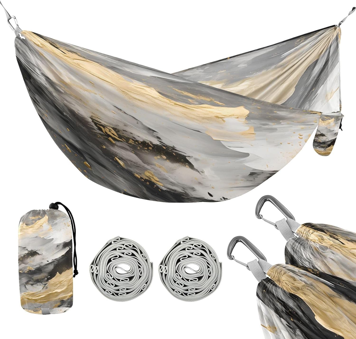Reliable Outdoor Relaxation This practical hammock delivers comfort and convenience for outdoor enthusiasts using quality materials and thoughtful engineering. Technical Details Material: 100% polyester (210T taffeta body; 600D polyester straps) Hardware: Aluminum carabiners Load Capacity: 500 lbs (227 kg) Packed Size: Approx. 7 x 5 inches (18 x 13 cm) Durable Construction Reinforced triple-stitched seams at stress points Quick-drying material Practical Applications Camping and backpacking Hiking rest breaks Beach and park outings Family relaxation Travel and festivals Package Includes 1. Hammock 2. Straps (2m each) 3. Carabiners 4. Storage sack Designed for Easy Use Sets up in minutes without tools. The balanced design provides stable support, while the breathable fabric prevents overheating during extended use.