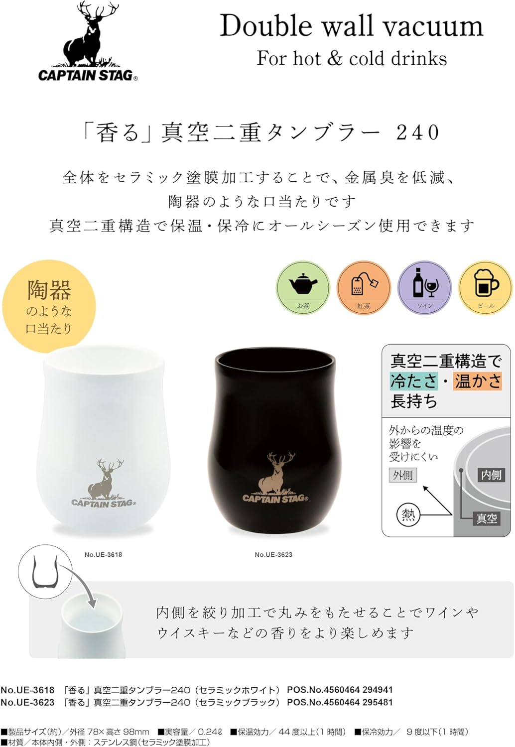 The entire ceramic coating process reduces metal odor and gives it a pottery taste. By squeezing the inside and making it rounded to make it more enjoyable to enjoy the fragrance of wine and whiskey. - Vacuum double wall construction (heat and cold insulation) Vacuum double walled construction keeps beverages at the temperature of the time you put them in, so they stay delicious. Keeps cold drinks cold and hot drinks hot and cold Even with hot beverages, the heat will not transfer to your hands and the cold drinks will not sweat easily. Product Size: Approx. Outer Diameter 3.1 x Height 3.9 inches (78 x 9Product Weight: Approx. 3.8 oz (98 g). Actual Capacity: 0.24L Heat Retention: Over 104°F (44°C) (1 hour), Cold Retention: Under 198°F (9°C) (1 hour) Material: Main unit, exterior: Stainless steel (ceramic coating coating). Country of Origin: China. Please note that we will not be responsible for any damages, damages or accidents arising from rental or auction or sale or used sales due to transfer.