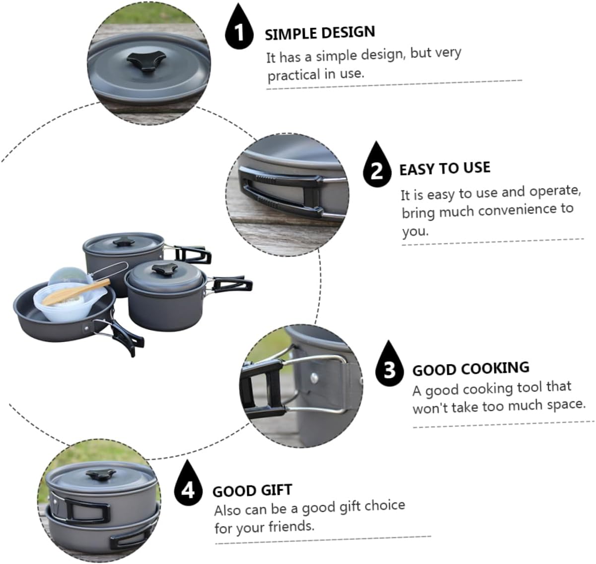 Package Include 1 x mesh bag 1 x frying pan 1 x small pot 1 x big pot 1 1 x soup spoon 1 x rice spoon 3 x bowls Features - Frying Pan Size: Approx. 17.9 x 4 cm / 7.05 x 1.57 inch Outdoor Cook Equipment. - Color: Assorted Color travel utensils. - Big Pot Size: Approx. 17.3 x 9 cm / 6.81 x 3.54 inch outdoor cooking equipment. - Small Pot Size: Approx. 15 x 7.2 cm / 5.91 x 2.83 inch outdoor travel equipment. - Material: Aluminum Alloy (Pot, Frying Pan); PP (Soup Spoon, Rice Spoon, Bowl) Portable Camping cookware. - Made of materials, and for long time use picnic cookware. - This outdoor cooking set is designed perfectly for 2-3 people camp cooking utensils. - It is so portable that you can take out with you and cook some food with your family or friends anytime and anywhere portable cookware for outdoor use. - Folding and portable, perfect for camping backpacking, hiking, picnic and other outdoor activities. camping cooking utensils - The camping cookware kit, including 1 big pot, 1 small pot, 1 frying pan, 3 bowls, 1 soup spoon, 1 brush, 1 rice spoon, 1 mesh bag camping supplies.Goods Descriptioncamp gear You can enjoy happy meal time outdoor.Cook Equipment Folding design, perfect for camping, hiking, picnic and other outdoor activities.camp utensils This camping cookware kit, made of materials, and .Camping Cookware Kit Also, it can be used