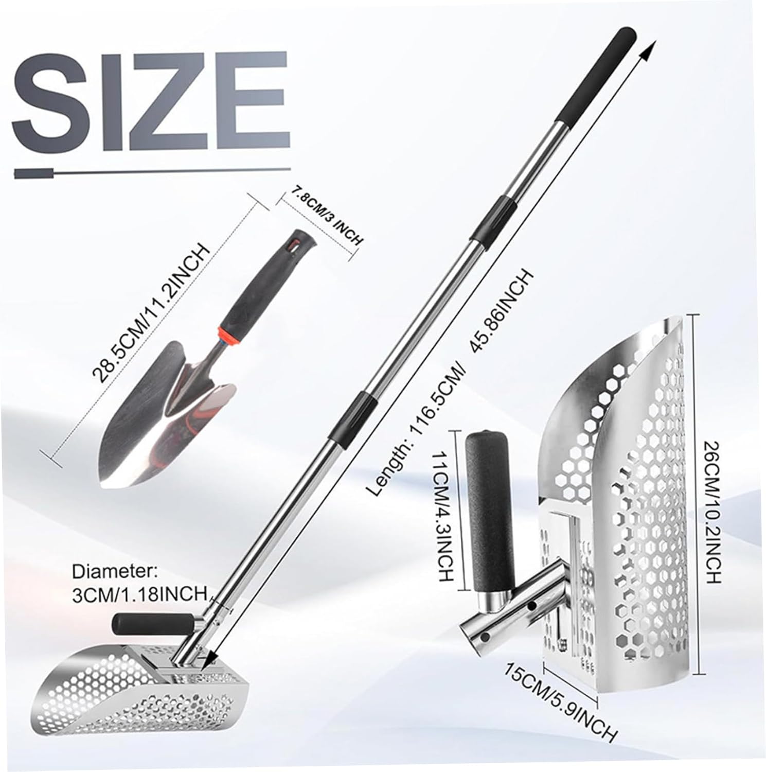 Description: Upgrade your beach adventures and metal detecting outings with our robust Sand Sifting Shovel. Crafted from heavy-duty 304 stainless steel, the shovel head resists rust and effect, standing up to tough environments from sandy shores to watery edges. The key to efficient treasure hunting lies in the design: numerous holes across the scoop let unwanted sand filter out rapidly, leaving potential finds like coin or rings clearly visible and within easy get. We understand that comfort is crucial when you're scanning the beach for hours. That's why this beach shovel is paired with a lightweight fiberglass handle. It provides a secure, ergonomic grip and saves your energy by increasing your operational radius, so you can dig and sift with less bending and strain. This isn't just a tool; it's your partner for discovery. Use it as a dedicated sand flea rake for bait collection, a reliable sifter alongside your metal detector, or a sturdy shovel for building sandcastles with the family. The included small trowel is perfect for precise digging or as a compact backup. After each use, a simple rinse is all it needs to stay clean and ready for your next quest. Make your next trip to the coasts more productive and fun. Features:. -Color: Silver. -Material: Metal. Note:Manual measurement, please allow slight errors on size.The colors may exist slight difference due to different screens. Package Including 1* Sand Shovel, 1* Small Shovel
