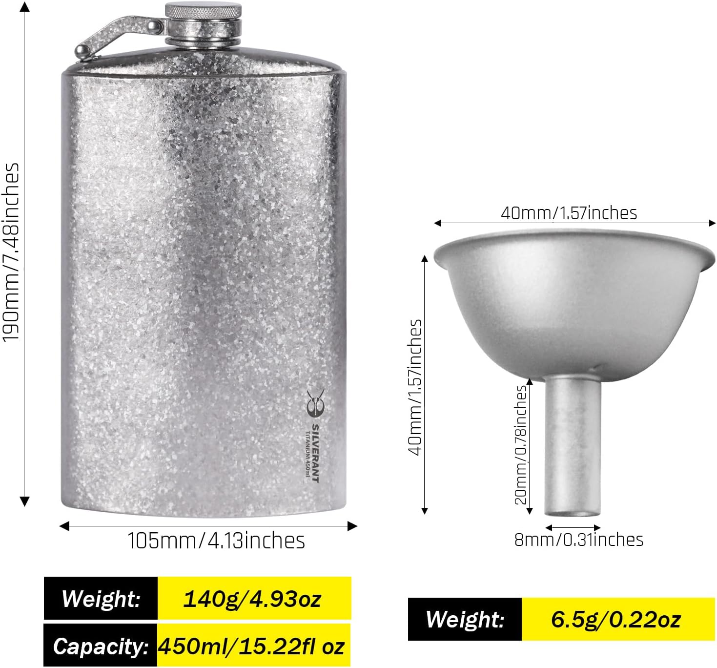 450ml Flask:Weight: 140g/4.93 ozCapacity: 450ml/15.22fl ozWidth: 105mm/4.13inchesHeight: 190mm/7.48inchesFunnel:Weight: 6.5g/0.22ozWidth: 40mm/1.57inchesHeight: 40mm/1.57nches