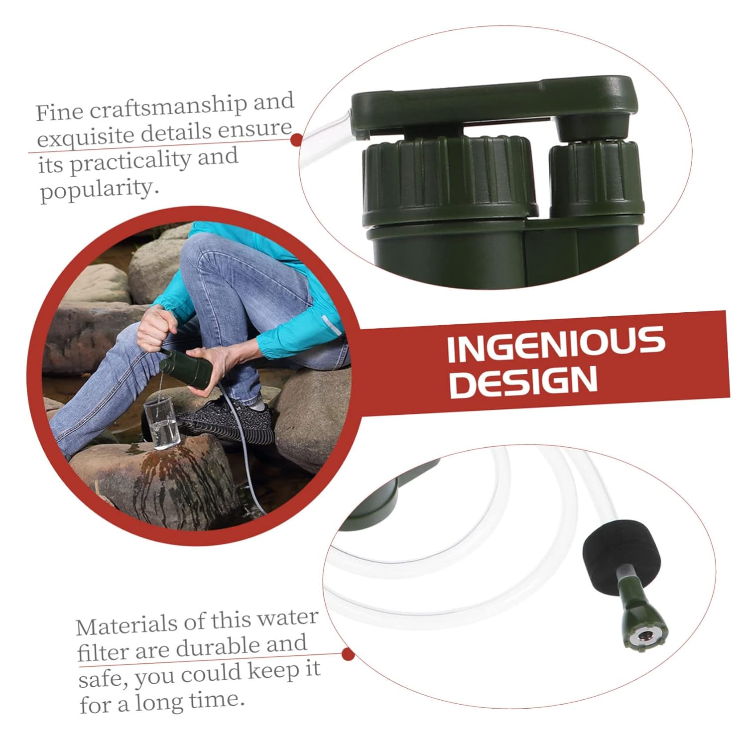 Package List 1 Filter Characteristics - Size: About 11.00X6.00X3.80cm/4.32X2.36X1.49inch camping water filter. - Color: Army Green water filtration system. - Material: ABS emergency water purifier. - The workmanship of the water filter will give you an excellent use experience water filtration device. - Lightweight and portable, simple to use, easy to carry water purifier pump. - Adopts precision production to the stable characteristics and high reliability survival water filter. - Materials of this water filter are and , you could keep it for a long time water purifier. - Fine craftsmanship and details ensure its practicality and popularity hiking water filter.Goods Descriptionemergency water purifier This portable water filter features the highest water safety standard, removes of .outdoor water filter for camping, hiking, backpacking, trekking, mountaineering, emergency and other outdoor adventures.water purifier Small and lightweight, portable enough for easy carrying or storage