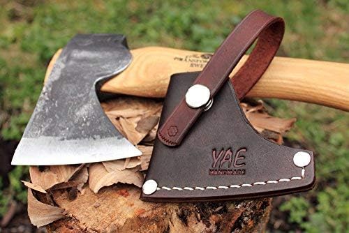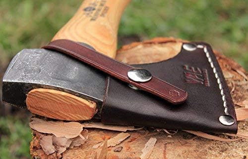 PLEAE MAKE SURE your axe cutting edge is no longer than 3 inches in order to fit into this sheath. This sheath is designed specifically and exactly for the Gransfors Bruks (or Bruk) Hand Hatchet. It is made out of full-grain vegetable-tanned cowhide, stained, and treated with Neatsfoot oil. The sheath is handmade in Spokane, Washington. The construction of the sheath starts with three pieces of leather: the main body of the sheath, the securing strap and the welt. The main body is folded over a welt that is inserted between the two folded halfs which prevents the blade of the inserted axe from cutting the stitching that is placed to hold the sheath together. The sheath is then hand stitched and rivets are placed at the corners to reinforce the body. The axe head blade, when placed in the sheath, is prevented from touching the rivets because of the welt. The retention strap is then secured with a rivet and a snap is added for easy on/off action. This sheath is built to last, and quality hand made in the USA (Spokane, Washington). Finish to the edges of the leather is applied for aesthetic appeal. The color of the leather may vary, and may be a darker or lighter brown. There may also be slight variations in the evenness of color distribution on the sheath. We also have an updated maker's mark stamp, please see last photo for detail. The makers mark in this picture is on a different product, but on this sheath, it will be stamped in the same location as the previous mark. The logo stamp is reads "ROG Handmade". Watch how this sheath is made on YouTube HERE: http://youtu.be/reL6CQi18xk?list=UUdKhV7sJiUTzlk7d6nKm-cQ