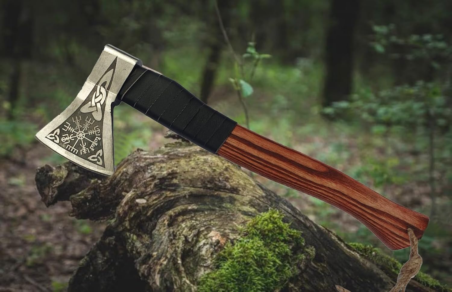 Inspire Epic Adventures: Ignite the spirit of adventure with the Viking Axe, a versatile companion for hunting, hiking, camping, wood carving hatchet, wood splitting axe and beyond. With its blend of exquisite craftsmanship and rugged durability, this tomahawk hatchet is more than just a weapon – battle axe real is a symbol of courage and exploration, inspiring epic conquest with every swing. Elevate your collection with our masterfully crafted bushcraft hatchet axe, the epitome of Viking craftsmanship. This hand hatchet axe isn't just a decorative piece – it's a functional weapon suitable for reenactments, live-action role-playing (LARP), or proudly displayed in your home. Crafted with precision, the camping axe boasts a stunning colorful wooden handle that not only ensures a comfortable grip but also adds a distinctive flair to its appearance. Combat hatchet ergonomic design makes it perfect for extended use without compromising on style. To ensure your hunting hatchet stays protected and ready for action, we've included a premium leather sheath. Constructed with double stitching, this small hatchet with sheath provides maximum durability and security, ensuring your wood hatchet axe remains securely in place wherever your adventures take you. Looking for the perfect gift for the adventure enthusiast in your life? Look no further than our combat axe. Whether it's for your husband, father, boyfriend, brother, or friends who love hunting, hiking, camping, or outdoor pursuits, this tomahawk axe is sure to impress on any special occasion. Unleash your inner warrior with our Viking Axe – a symbol of strength, heritage, and adventure. More than just an axe tool, it's a testament to the Viking spirit within us all. Whether you're a seasoned enthusiast or a novice explorer, the throwing hatchet is ready to accompany you on your next adventure, embodying the essence of true craftsmanship and timeless style.