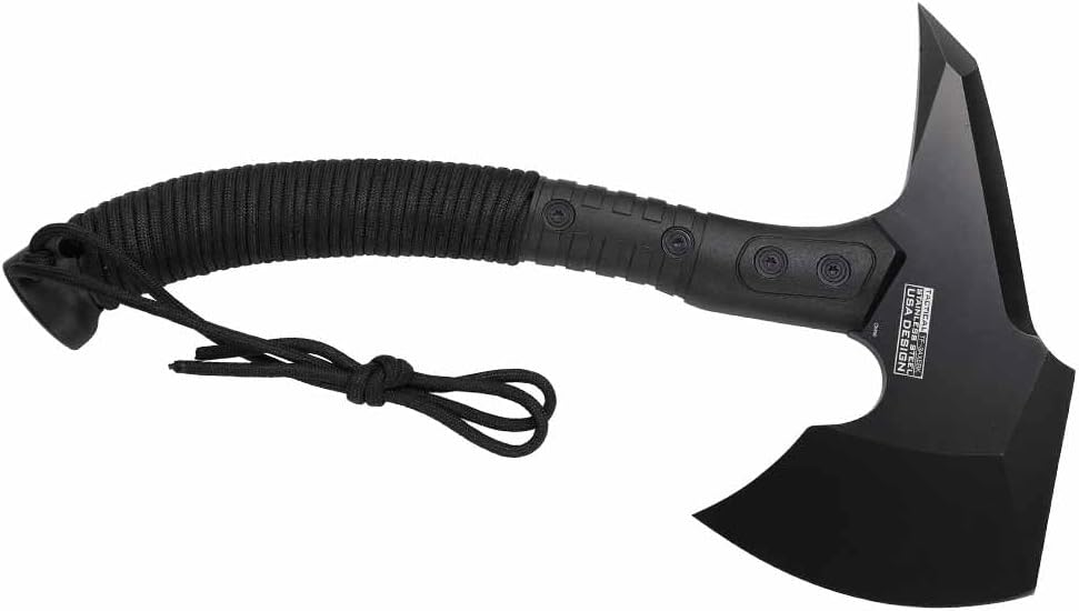 This tactical tomahawk combines robust functionality with precision engineering. Measuring 11.7 inches in overall length, it features a 4-inch blade crafted from durable 3Cr13MoV steel with a black oxidized finish for enhanced corrosion resistance. The extended 10-inch handle is wrapped in cord over nylon fiber, providing a secure, comfortable grip during use. The thoughtfully designed handle incorporates reinforced construction for added durability and control. A reinforced nylon fiber sheath is included for safe storage and transport. The balanced proportions and tactical styling make this tomahawk equally suitable for utility tasks and outdoor activities. The fine edge delivers clean, precise cuts, while the robust construction ensures reliability under demanding conditions. With its practical dimensions and purposeful design elements, this tomahawk offers versatility for various applications while maintaining a compact, portable form factor.