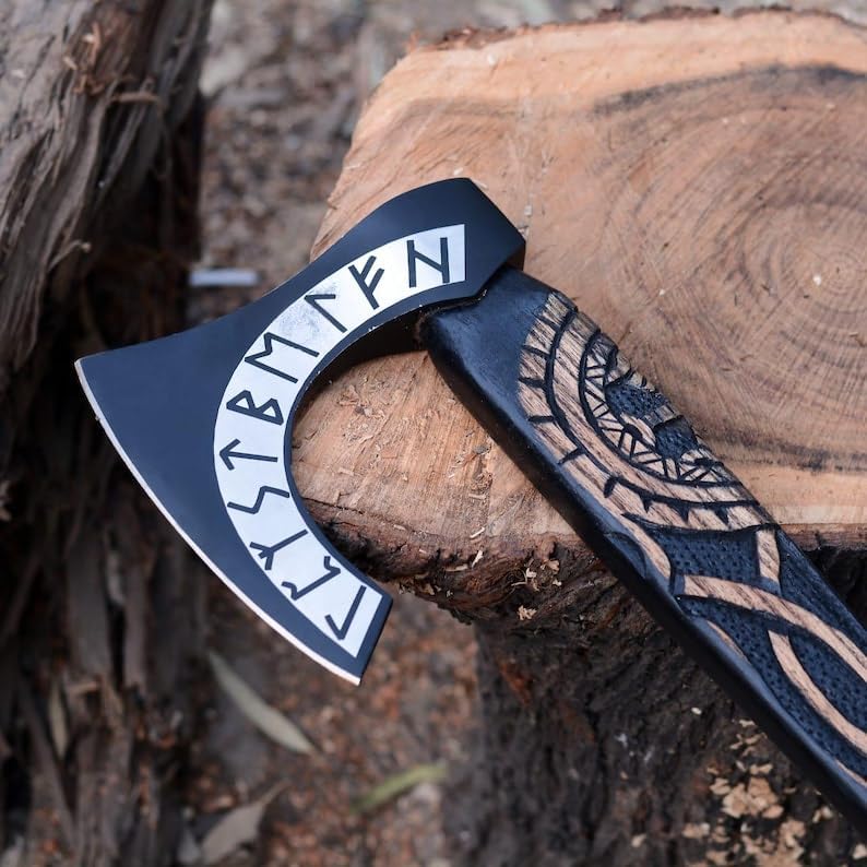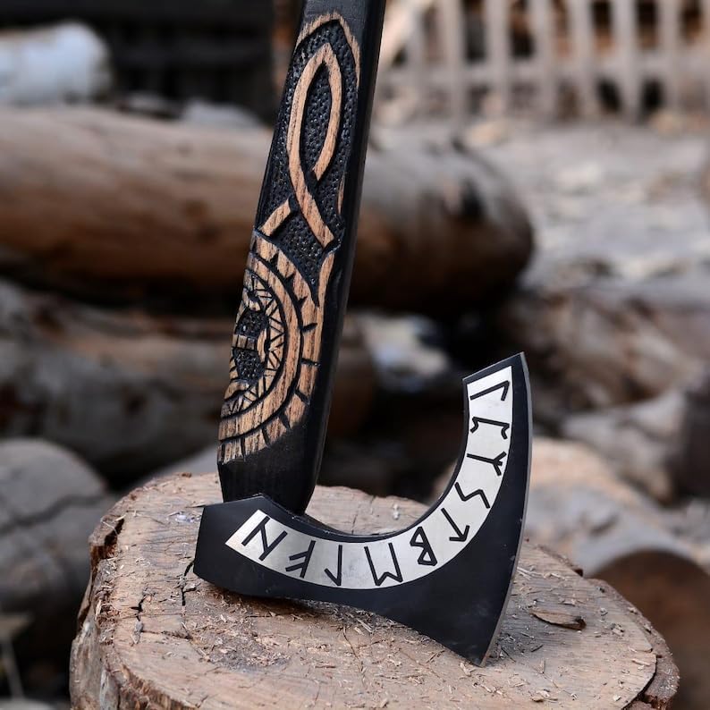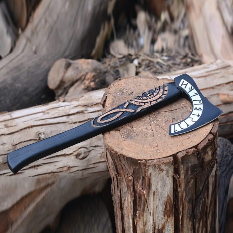 ⚔️ Awaken the Spirit of the North! Step into Norse legend with this Handcrafted Viking Bearded Axe, beautifully etched with ancient runes and symbols of Norse mythology. Meticulously crafted from high-carbon steel and seasoned hardwood, this axe combines functionality, heritage, and artistry in one powerful display piece. Whether you’re a mythology lover, a cosplayer, or seeking a personalized Viking gift, this decorative battle axe is sure to leave a lasting impression. Each piece is handmade to order, making every axe uniquely yours.