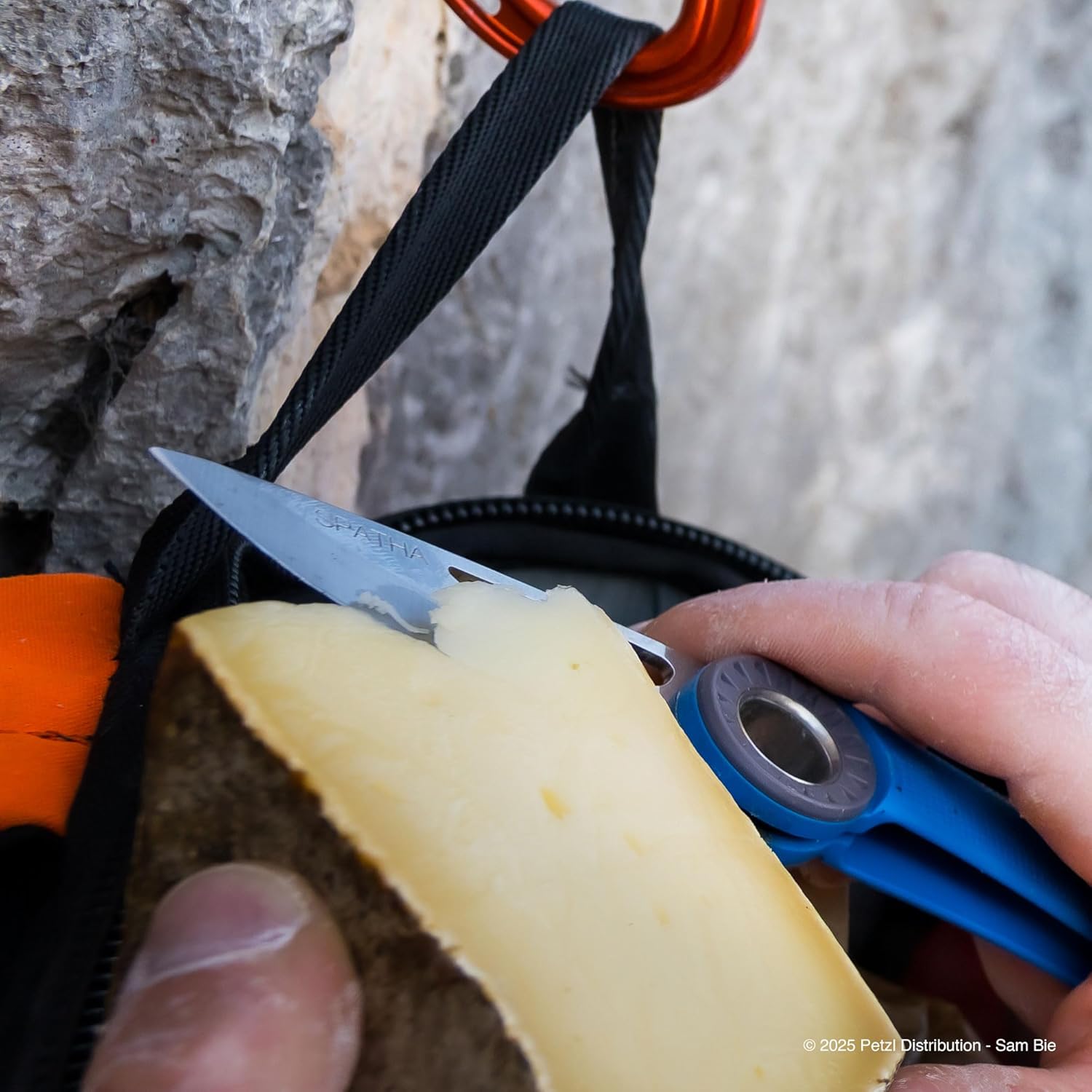 The SPATHA clippable knife is designed to accompany the climber on every outing. The profile of the blade allows easy cutting of ropes and cordage. It has a carabiner hole for attaching the knife to the harness. It is easy to manipulate with its textured wheel, even when wearing gloves, and can be locked in the open position.
