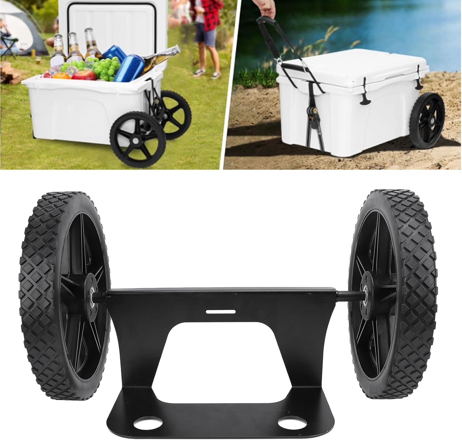 Cooler Cart Kit with 12 Inch Wheels, Steel Frame Utility Wagon for 15.5‑17.5 Inch Coolers, High Load Capacity Outdoor Transport CartItem Type: Cooler Cart KitSize: Approx. 12in / 30.48cmApplication:Applicable for 15.5 inches and 17.5 inches coolers for camping and beachWeight: Approx. 4650.00g / 164.02ozPackage List:2 x Tire1 x Stand2 x Nylon Strap4 x Washer4 x Screw4 x Nut4 x Axle1 x Assembly Guide